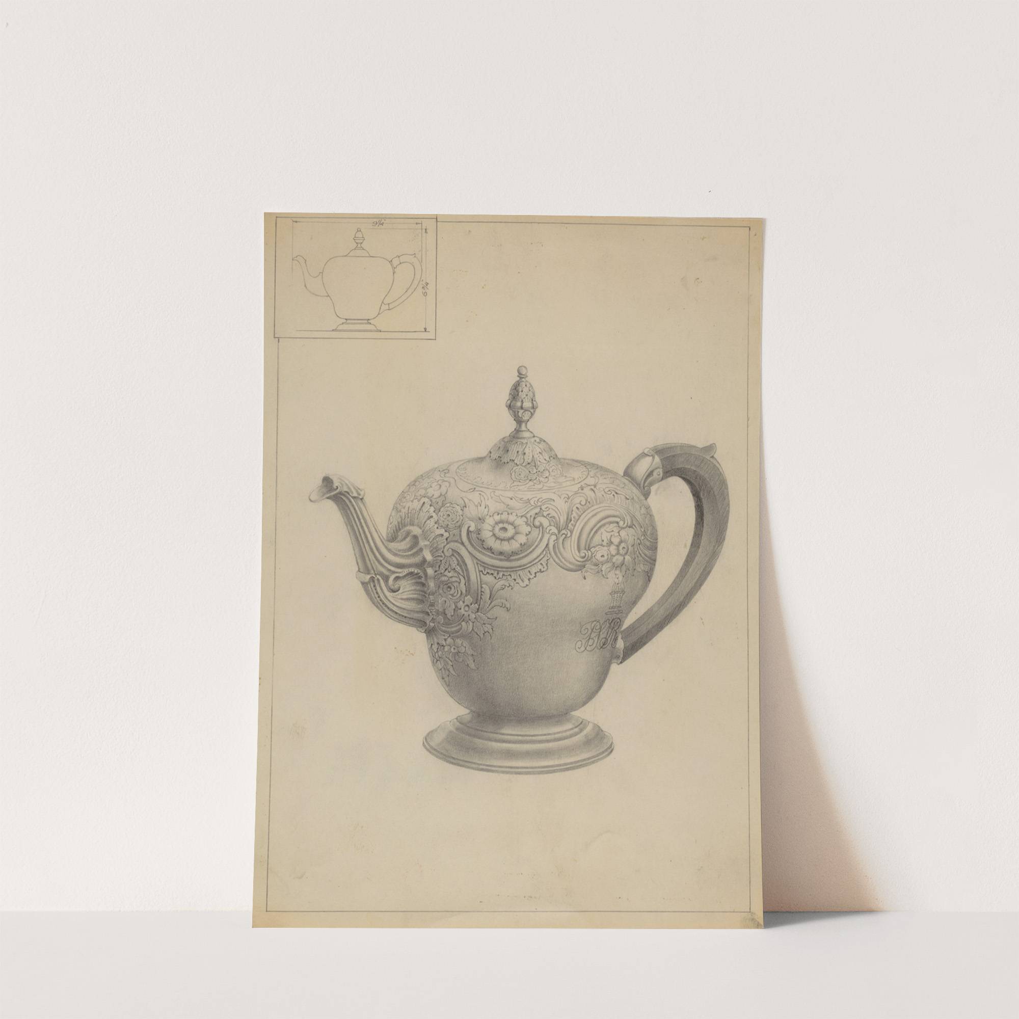 This elegant tea set print showcases a beautifully detailed silver teapot with intricate floral and vine motifs adorning its surface. The teapot features a classic round body with a slightly raised, ornate lid that has a small finial on top....