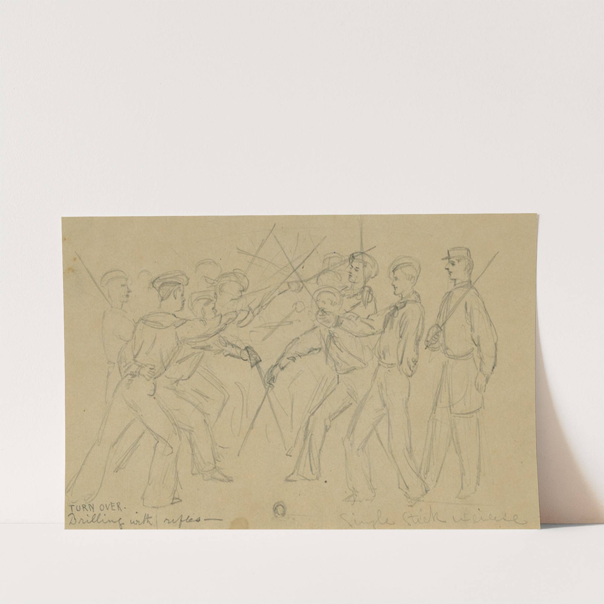 This art print features "Single Stick Exercise" by Alfred Rudolph Waud, showcasing a dynamic pencil sketch of six naval officers engaged in a fencing match. The drawing is rendered with delicate lines on a light yellowed paper, giving it an...