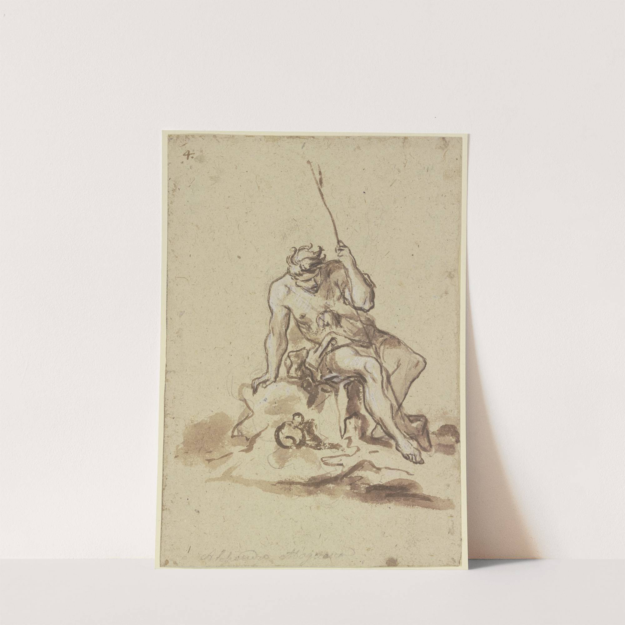This exquisite art print features "Sitting Shepherd," a captivating drawing by the renowned artist Alessandro Magnasco. The image is rendered in delicate sepia tones with fine, expressive lines that capture the tender moment of rest. A muscular male figure sits...