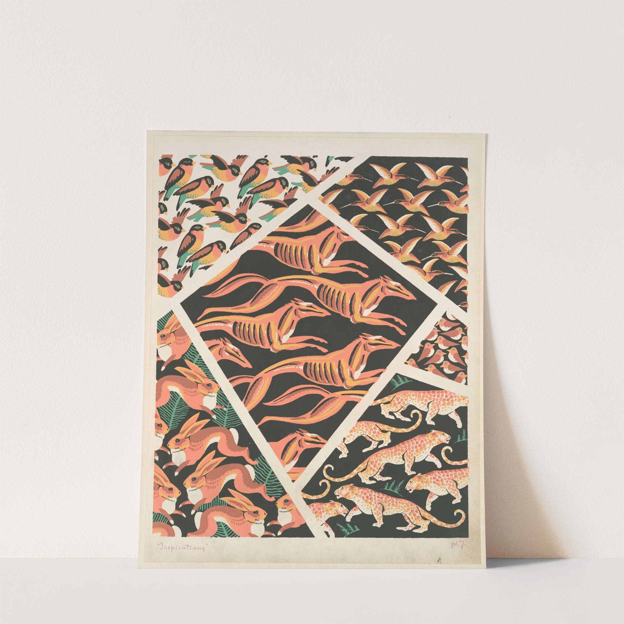 This vibrant art print features an abstract composition of animal forms, created by André Durenceau in his distinctive style. The piece is divided into four triangular sections, each showcasing different animals in bold colors and intricate patterns. In the top...