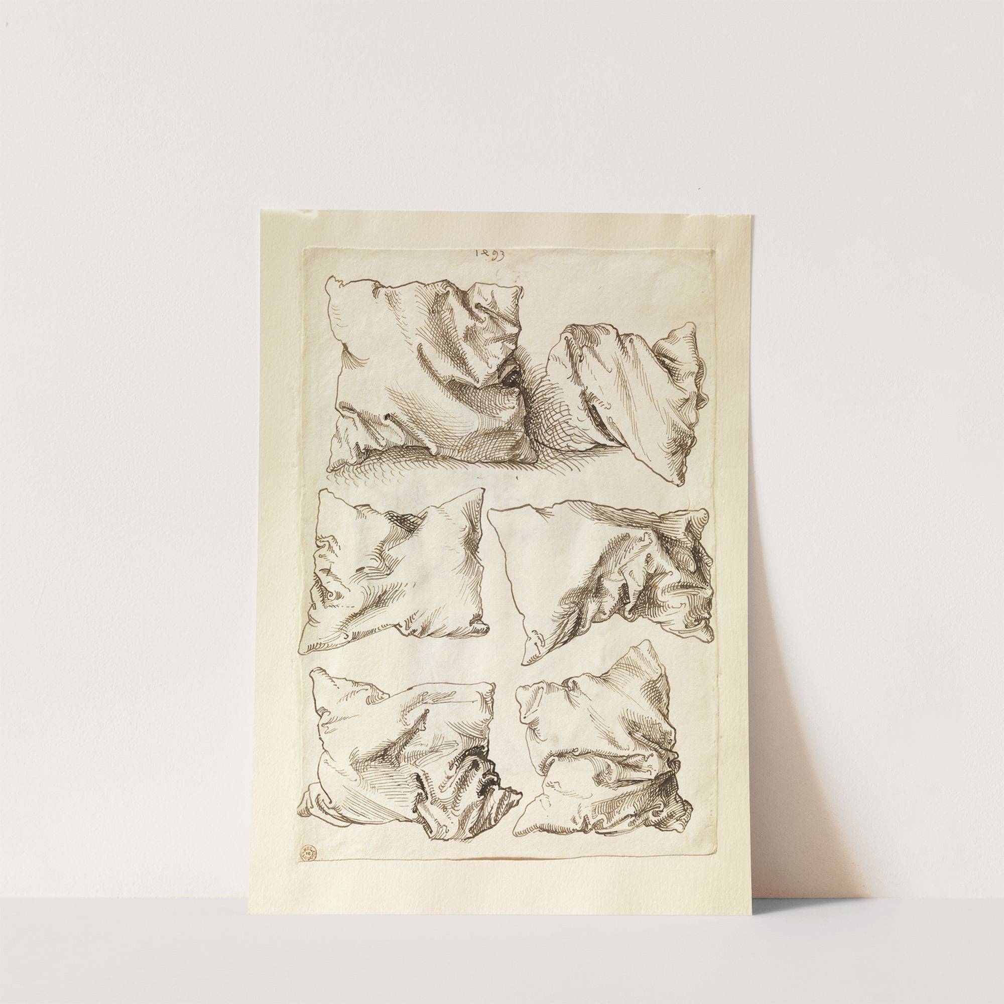 This art print features "Six Studies of Pillows" by renowned artist Albrecht Dürer, created in the 15th century. Rendered in fine black ink on aged paper, each pillow is meticulously detailed with intricate shading and cross-hatching that showcases Dürer's exceptional...
