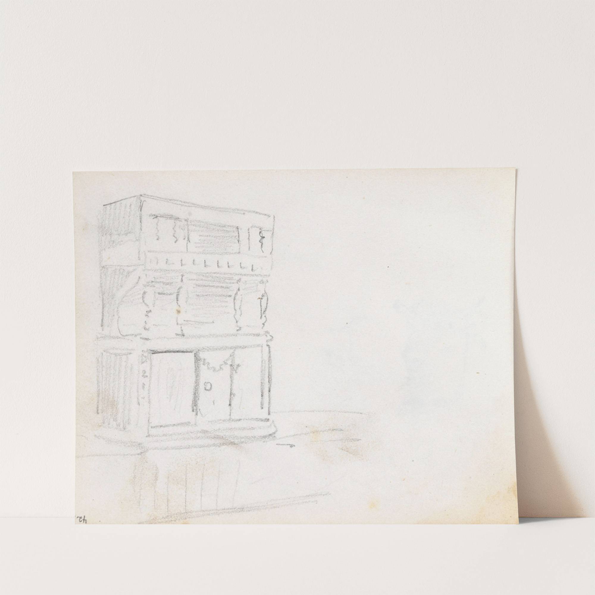 This minimalist black-and-white line drawing presents a simple yet detailed depiction of an old-fashioned wooden cabinet. The artist, Skap (1848) as attributed to Adolph Tidemand, utilizes fine pencil lines to create the structure and texture of the cabinet, emphasizing its...