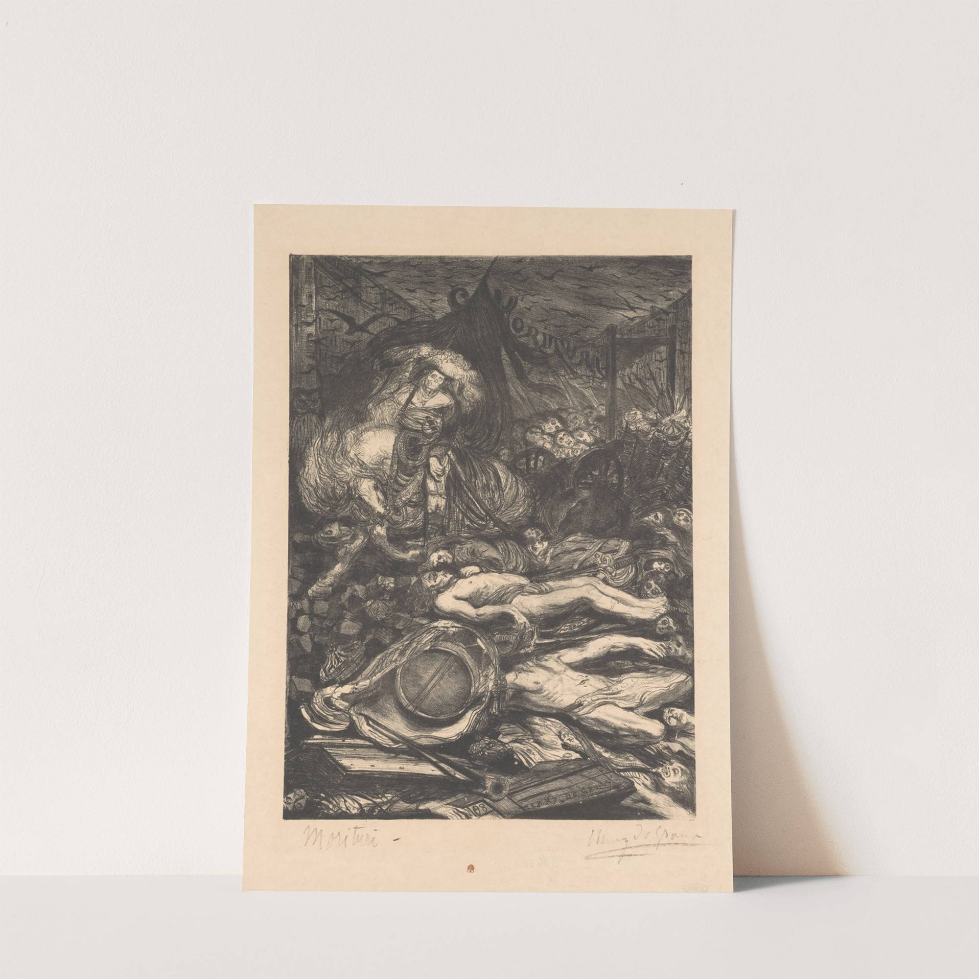 Skelet te paard rijdt over gevallen strijders en puin by Henry de Groux - Wall Art Print