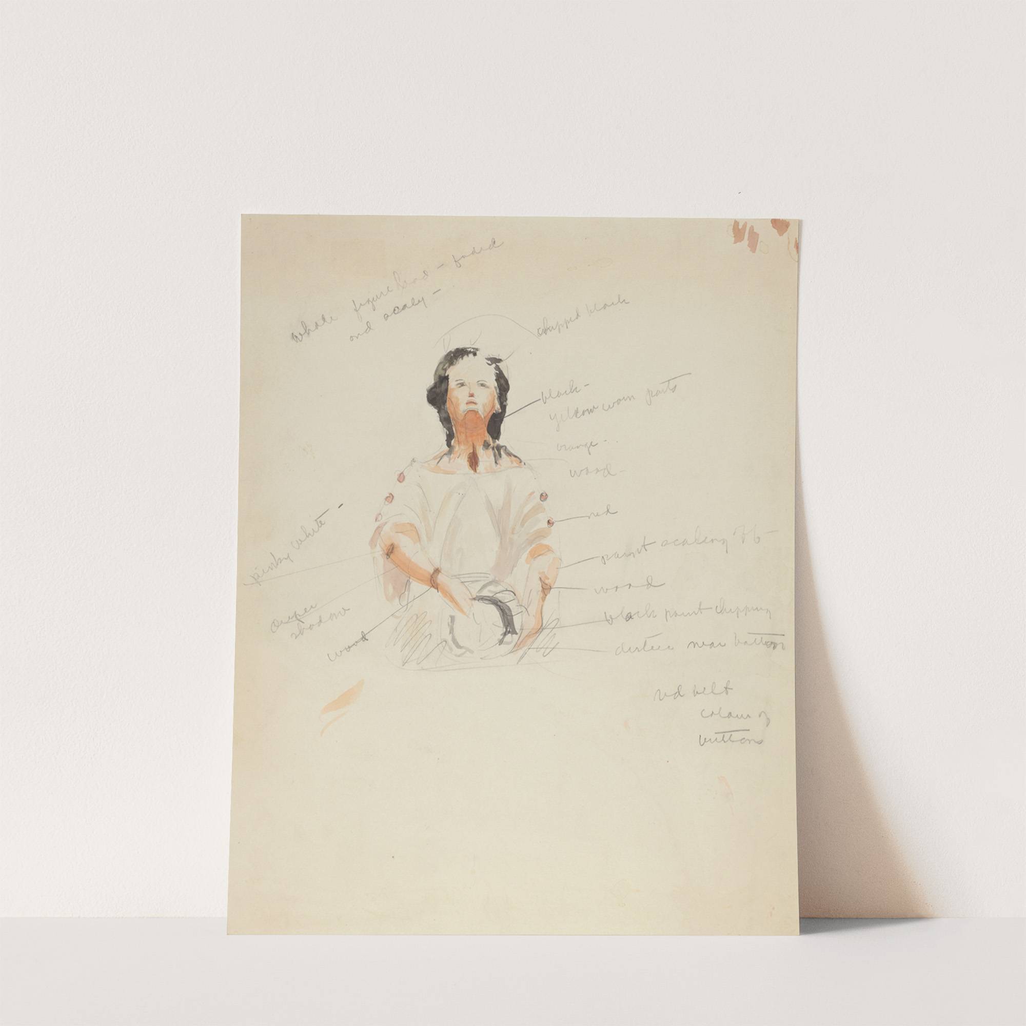 This art print features "Sketch of Figurehead" by an American 20th-century artist. The composition showcases a soft, ethereal portrait of a figure in the foreground. Rendered in delicate, watercolor-like strokes, the subject has short, dark hair and an expression that...
