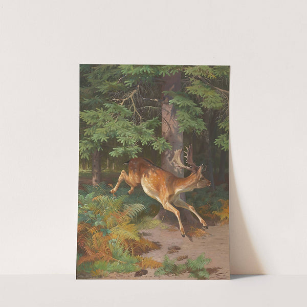 Capture the beauty of nature with this exquisite art print by Adolf Mackeprang titled "Skovparti med kronvildt i en lysning." This stunning piece depicts a graceful deer in mid-leap, its slender body and elegant antlers poised against a backdrop of...