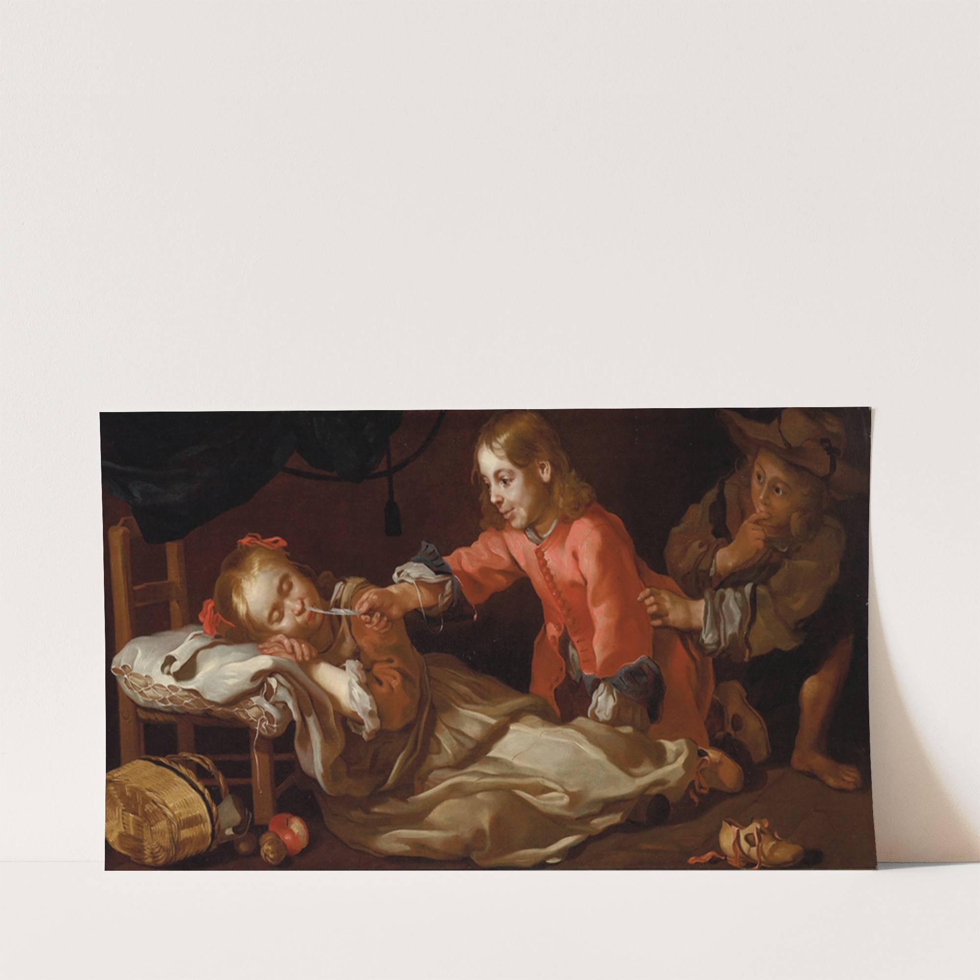 Sleeping girl with two children playing by Bernhard Keil - Wall Art Print