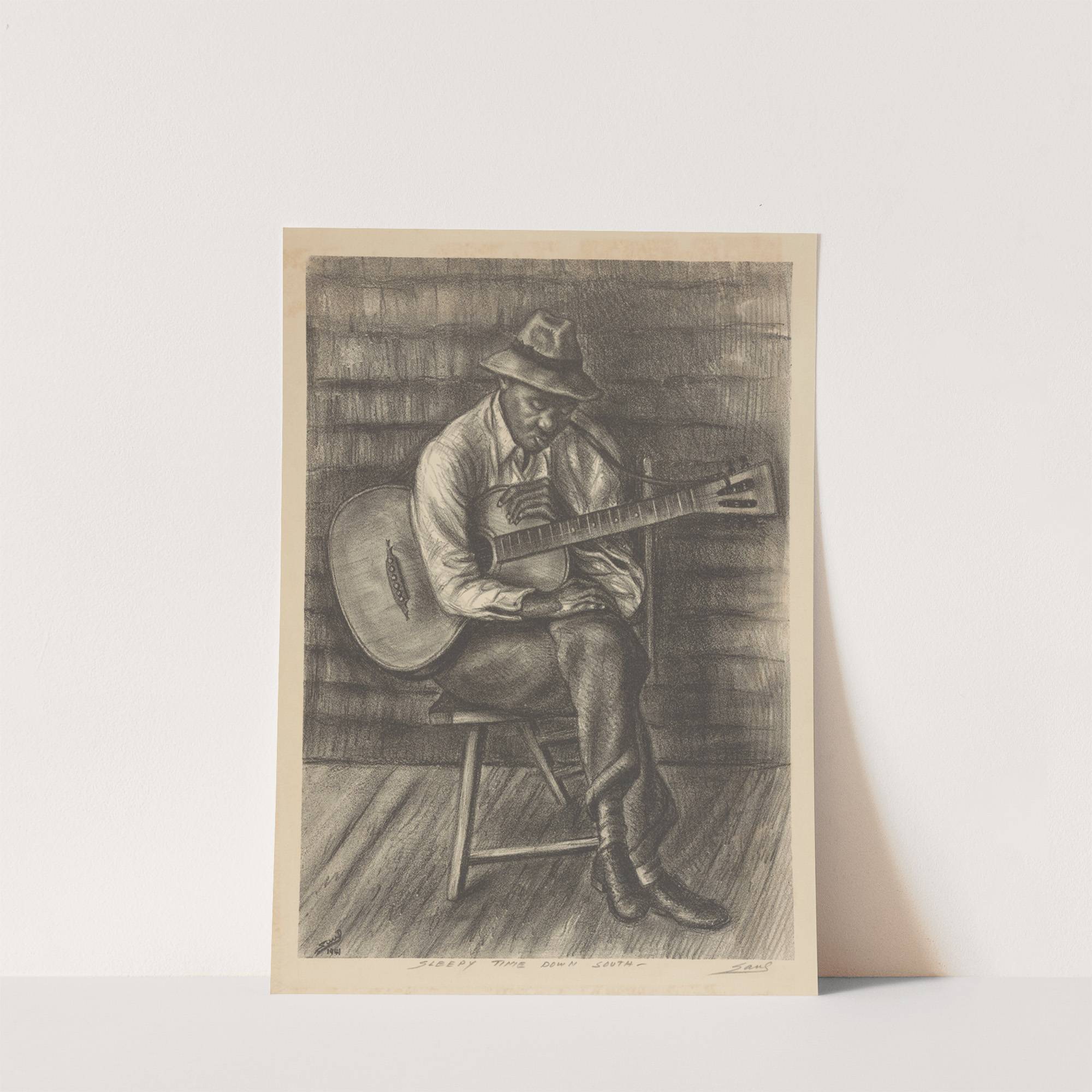 This black and white etching depicts a serene musical performance captured with meticulous detail. The central figure is an older man sitting on a simple wooden stool in what appears to be a rustic room, suggested by the textured, wooden-paneled...