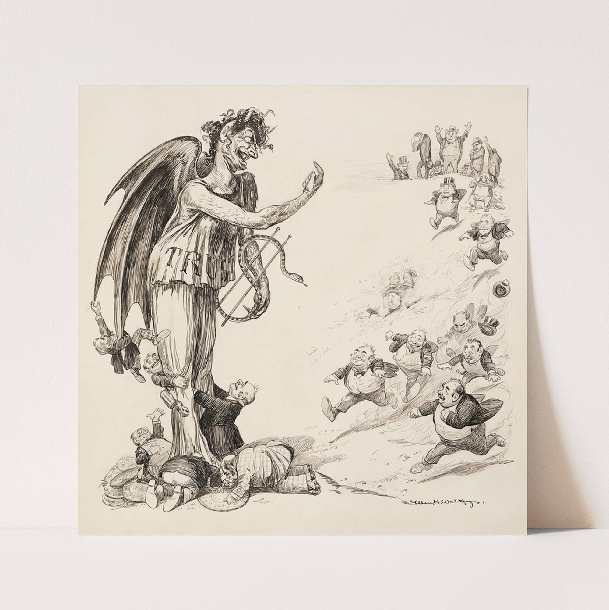 Small men in suits run towards a demon, representing the Trusts, and kiss his feet (1901) by William Henry Walker - Wall Art Print