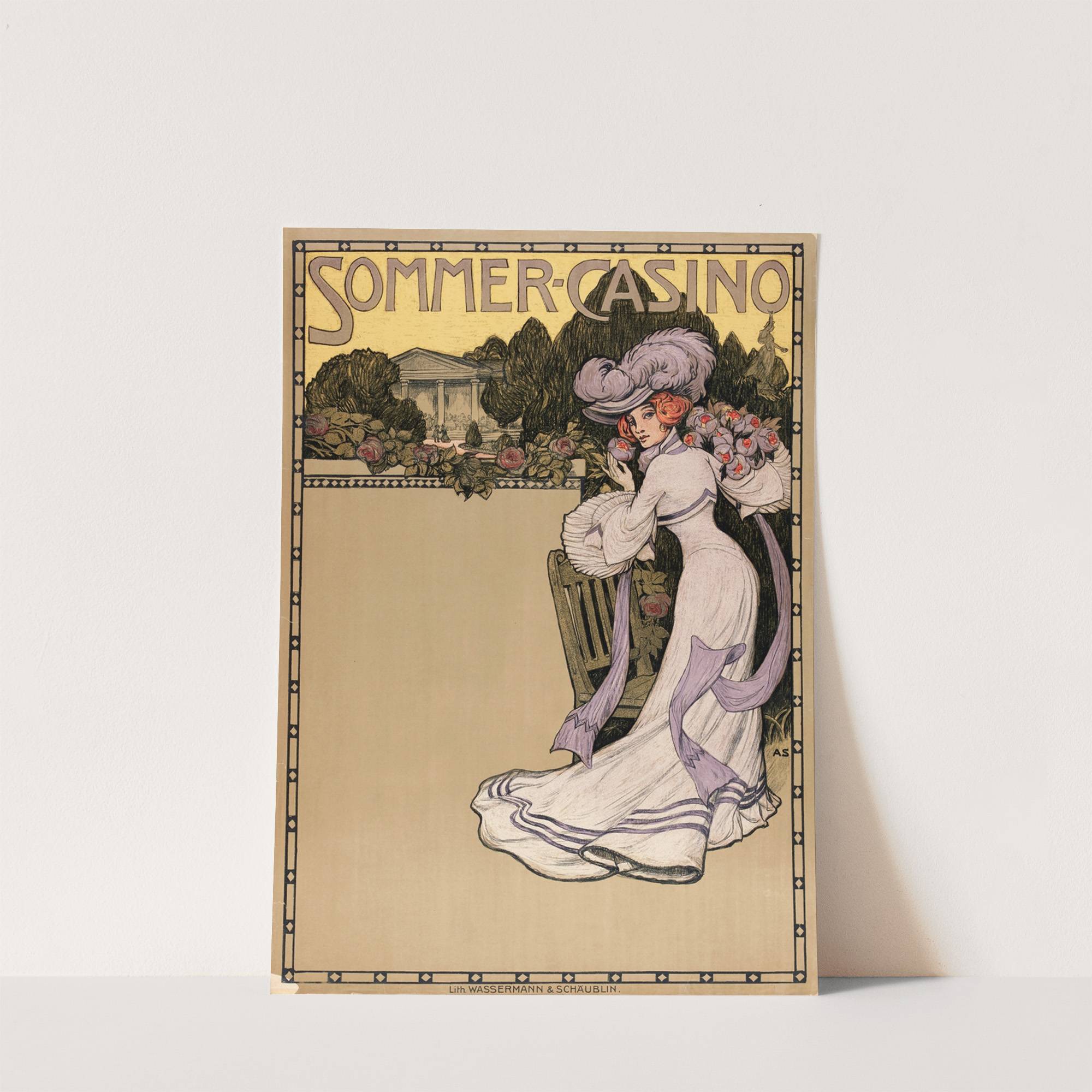 This artwork by Adolf Siegrist, titled "Sommercasino" from circa 1910, captures the essence of early 20th-century elegance with striking precision. The centerpiece is a young woman with fair skin and red hair adorned with vibrant pink flowers, standing in a...