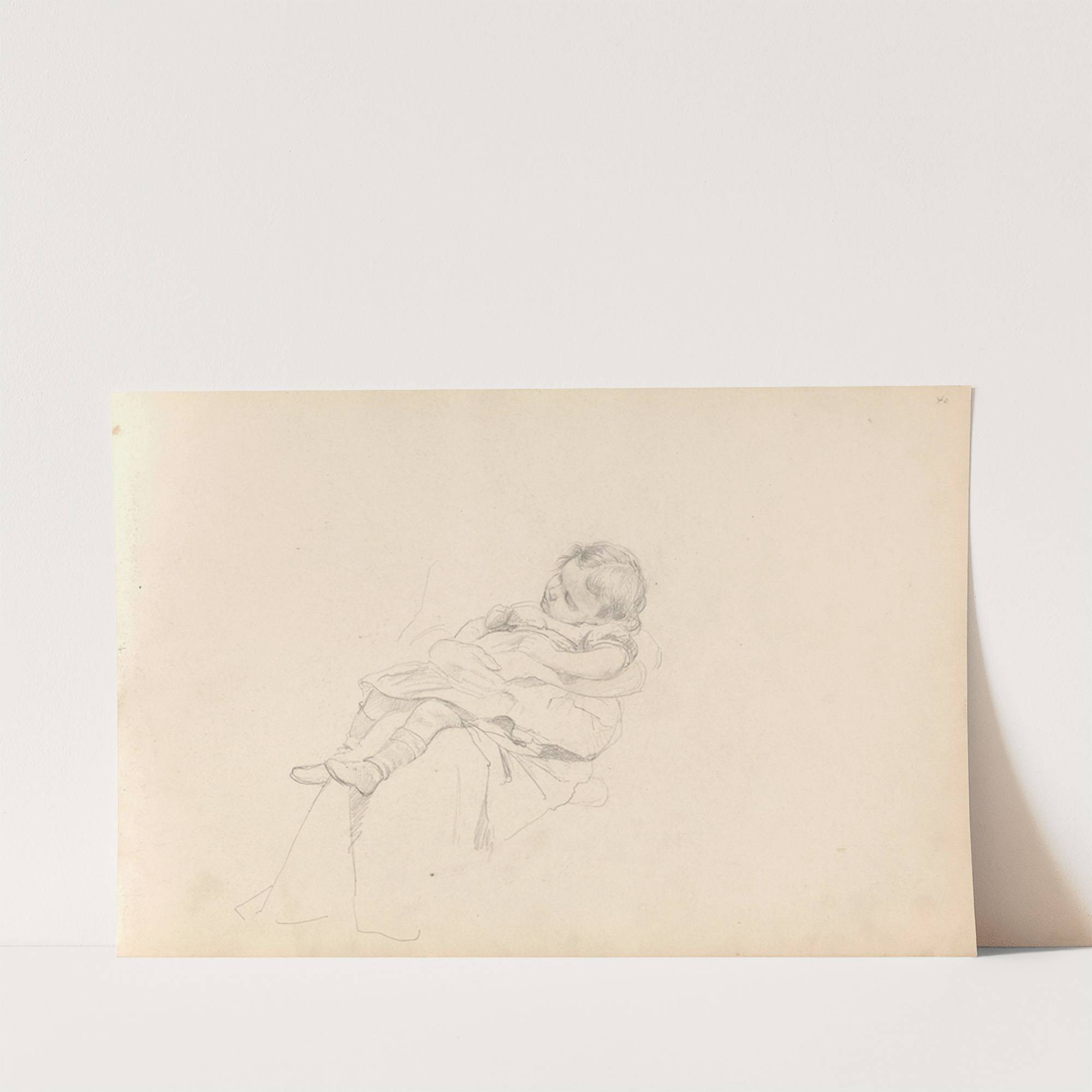 This delicate pencil sketch captures a tender moment between a young child and an adult figure, likely their guardian or caretaker. The child is seated in the adult's lap, leaning against them for comfort. The child's head is slightly tilted,...