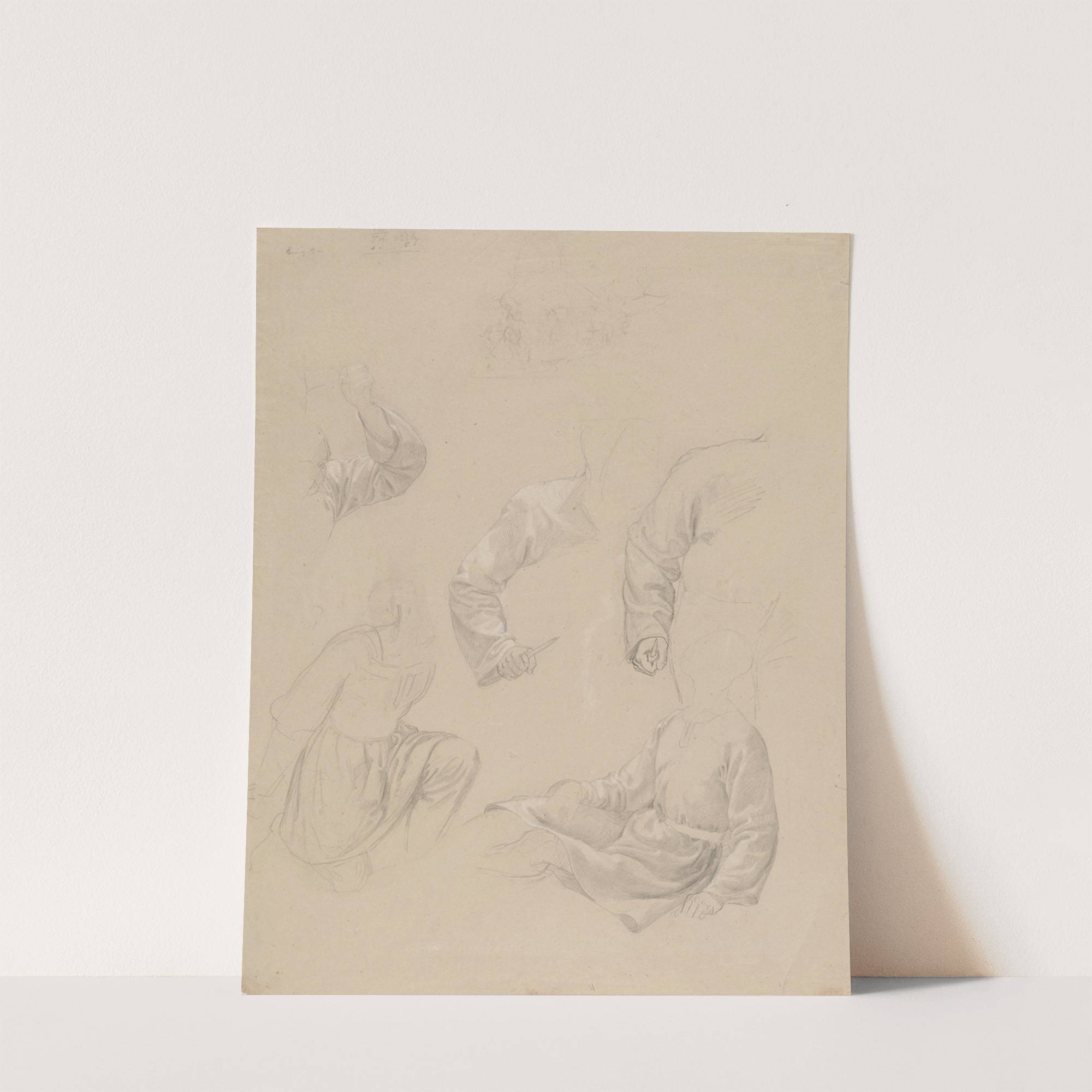 This beautifully rendered pencil sketch by the artist Adolph Tidemand captures several human figures in dynamic poses, each showcasing the intricate movement of their limbs. The artwork features three main subjects: one figure seated on the left, another figure caught...