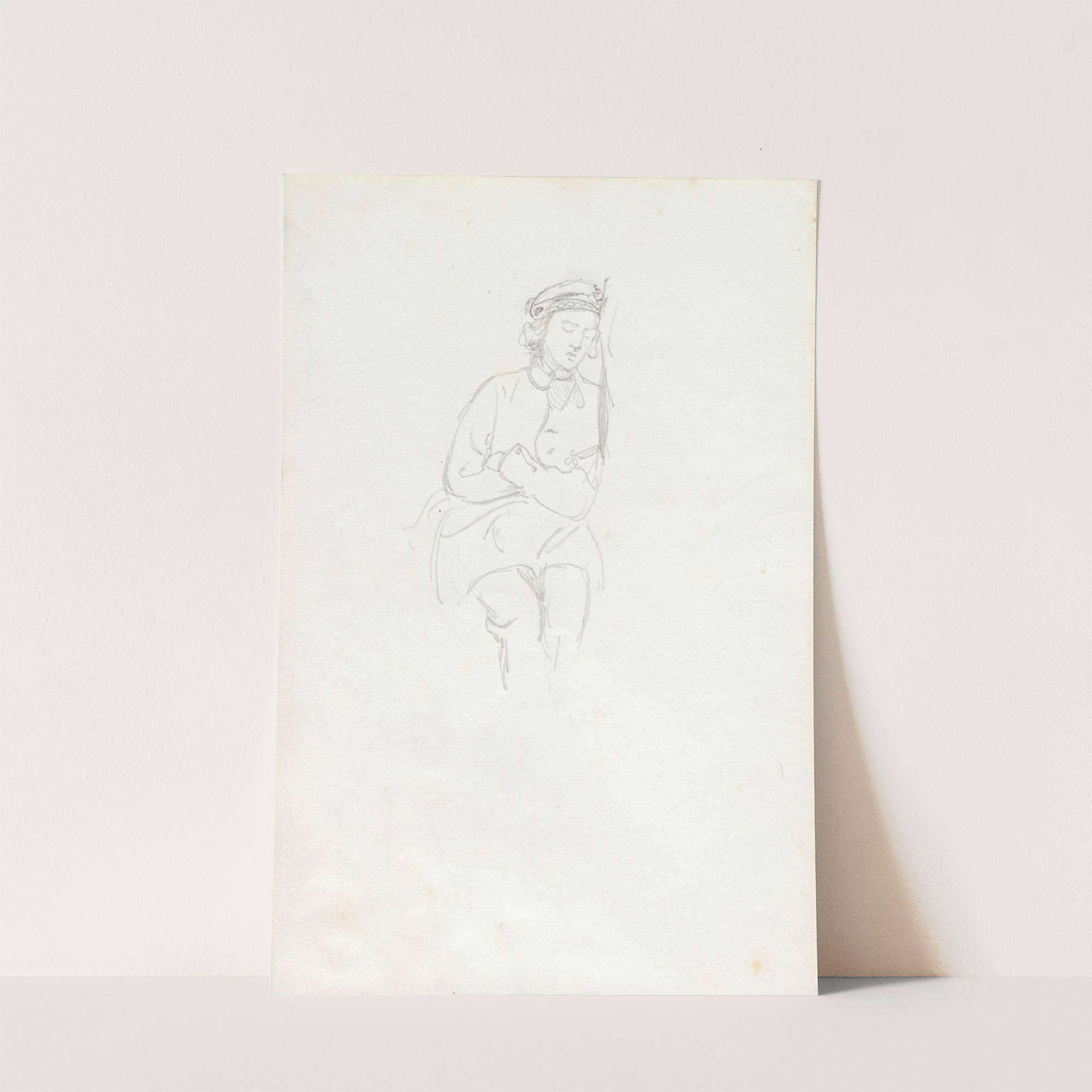 This art print features "Sovende mannsfigur (1842)" by Adolph Tidemand, presented in a minimalist, line-art style. The delicate black lines create a graceful portrait of a young woman with long hair gently cascading over her shoulders. She is dressed in...