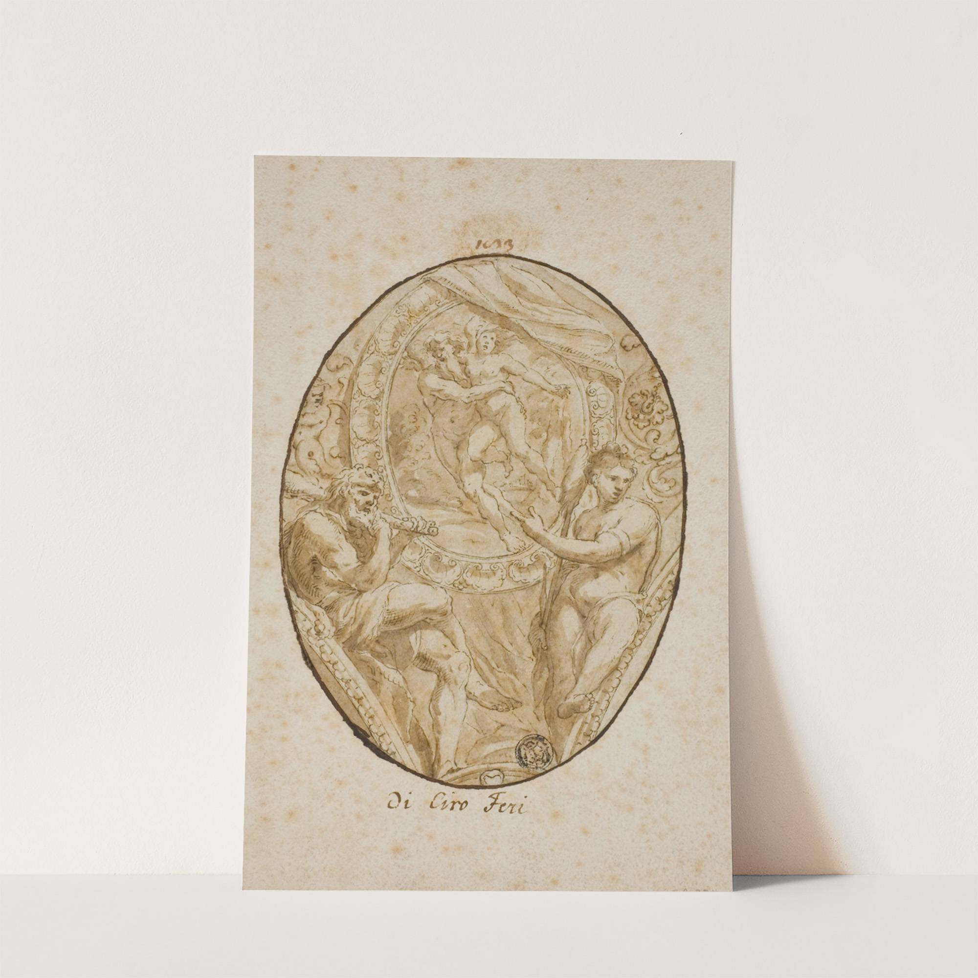 This exquisite artwork depicts "Spandrel with Rape of Orythia Flanked by Hercules and Omphale," masterfully rendered in a classical Baroque style. The circular composition is intricately carved from aged, beige-toned stone, showcasing remarkable depth and detail. At the center, a...