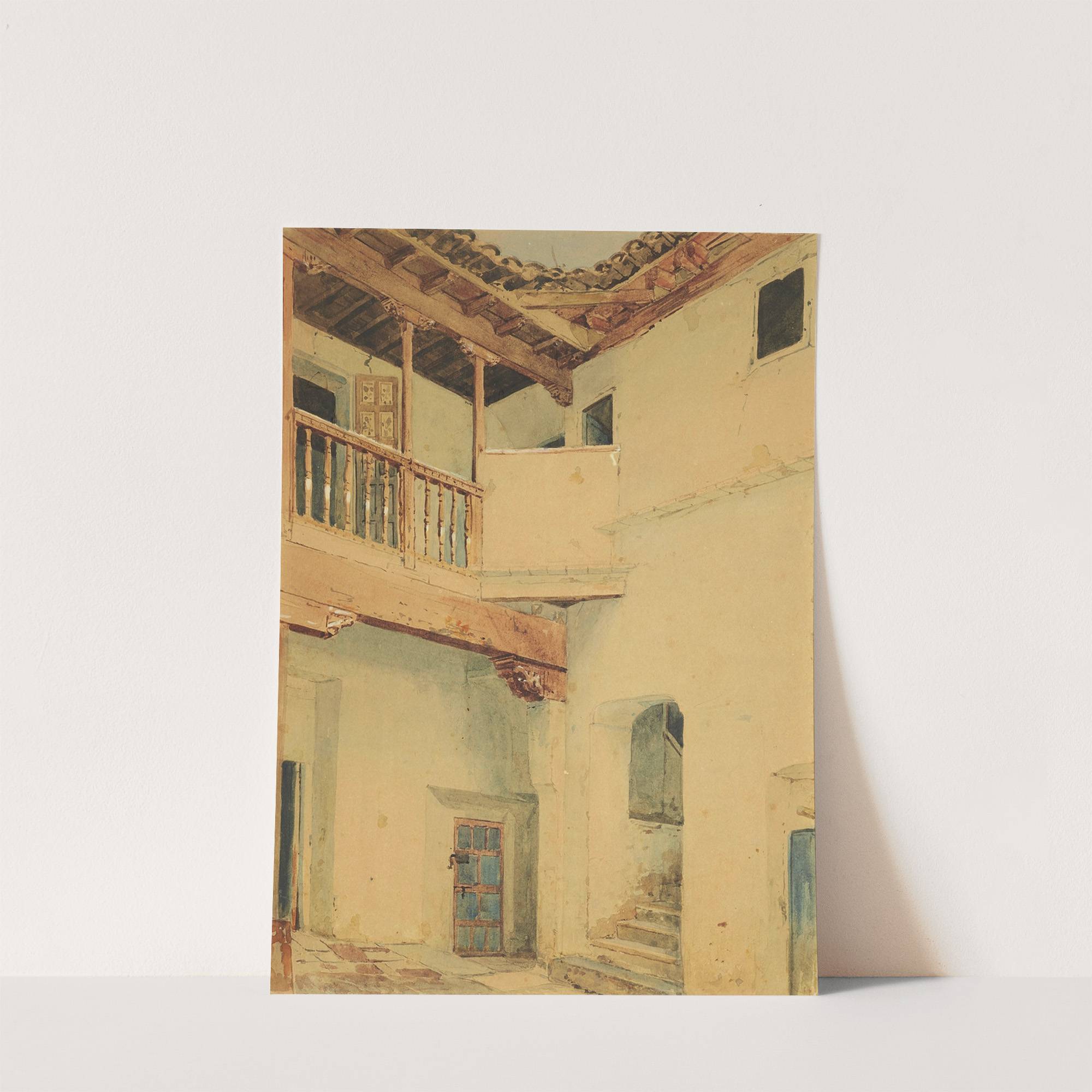 This art print features "Spanischer Innenhof" by Adolf Seel, capturing the essence of an old Spanish courtyard interior with remarkable detail. The composition showcases a rustic, two-story building with weathered walls in muted beige tones. A balcony on the upper...