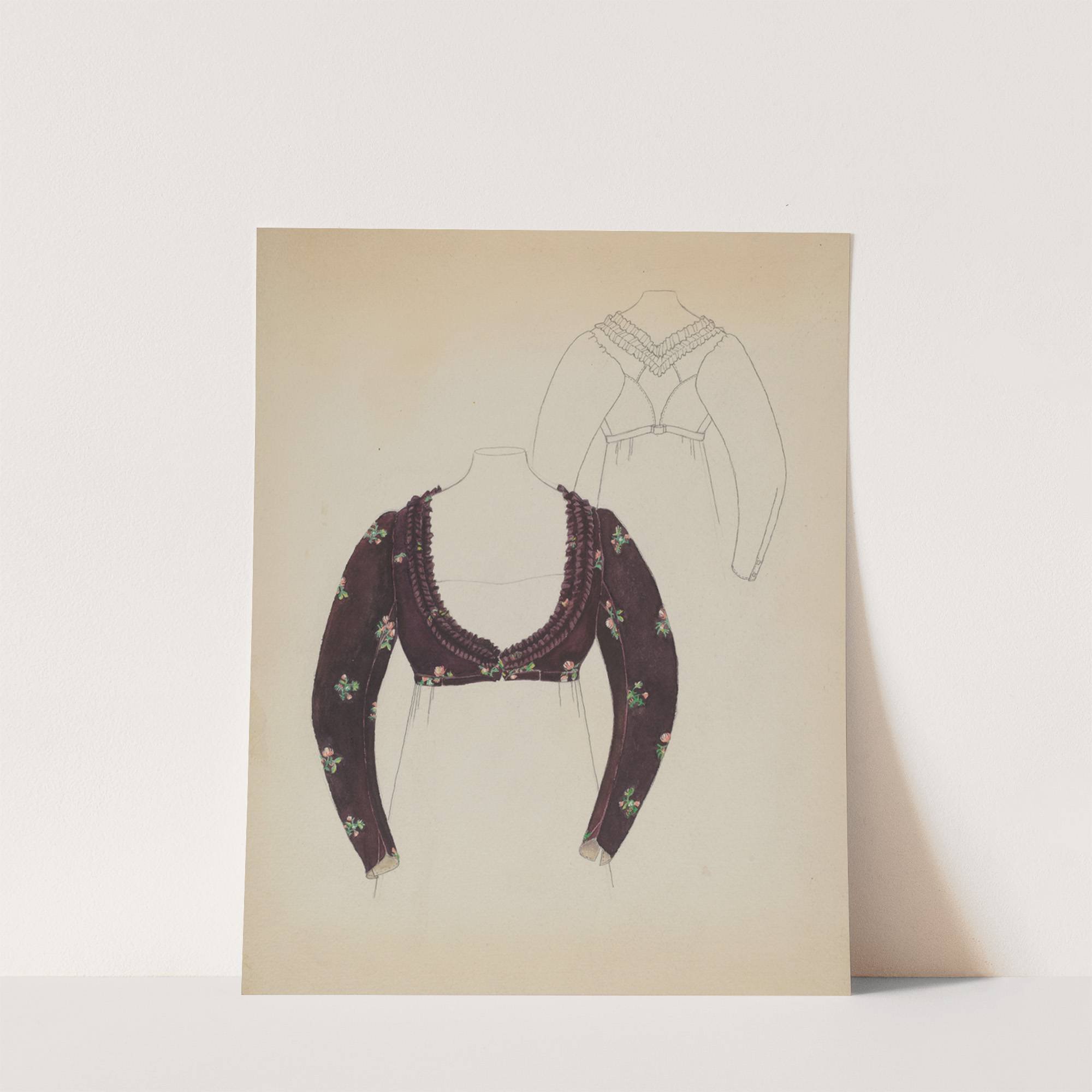 This elegant garment illustration showcases a timeless design perfect for fashion enthusiasts and collectors alike. The main piece features a richly dark purple blouse adorned with delicate floral patterns in soft green and pink hues, adding a charming touch of...