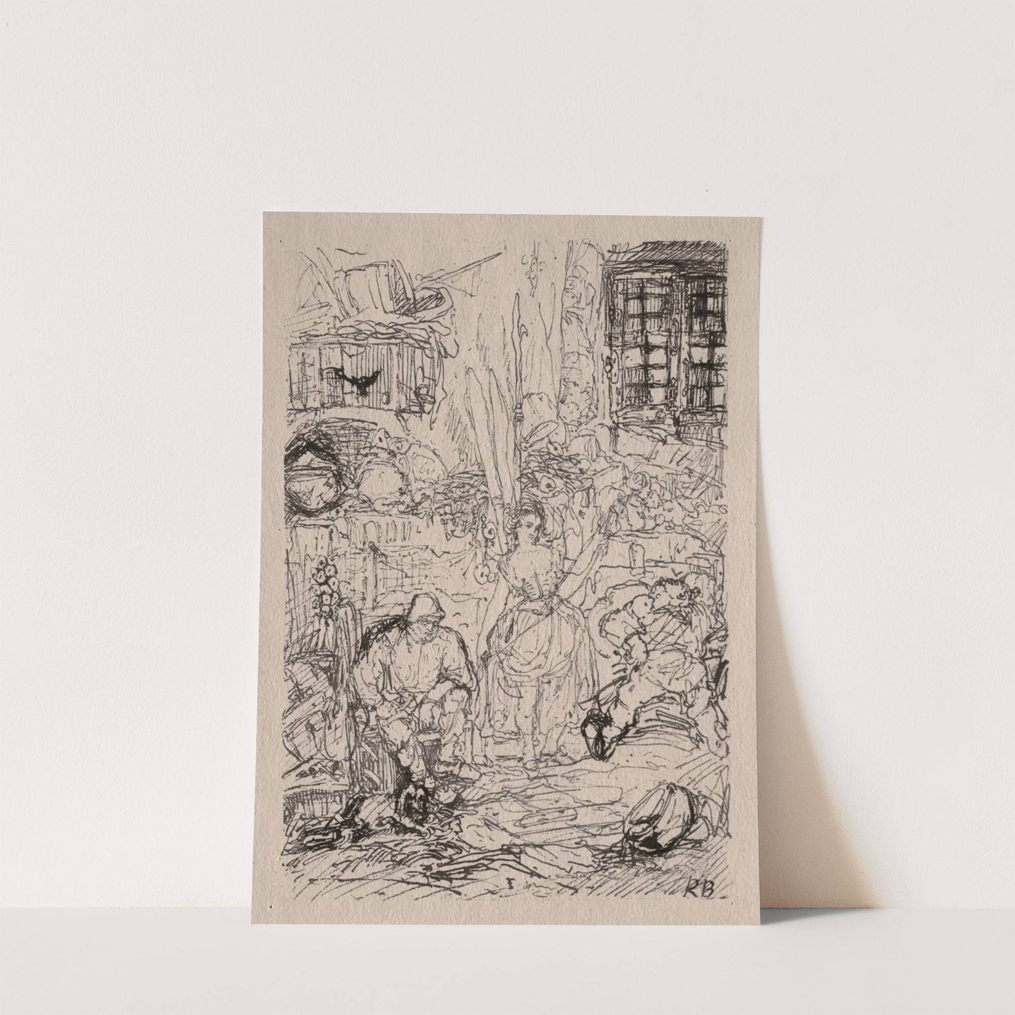 This black-and-white sketch titled "Spinner's Interior" by the artist Rodolphe Bresdin captures an intriguing scene with dynamic energy and detailed line work. The composition features a variety of characters engaged in different activities within a rustic, brick-walled room. At the...