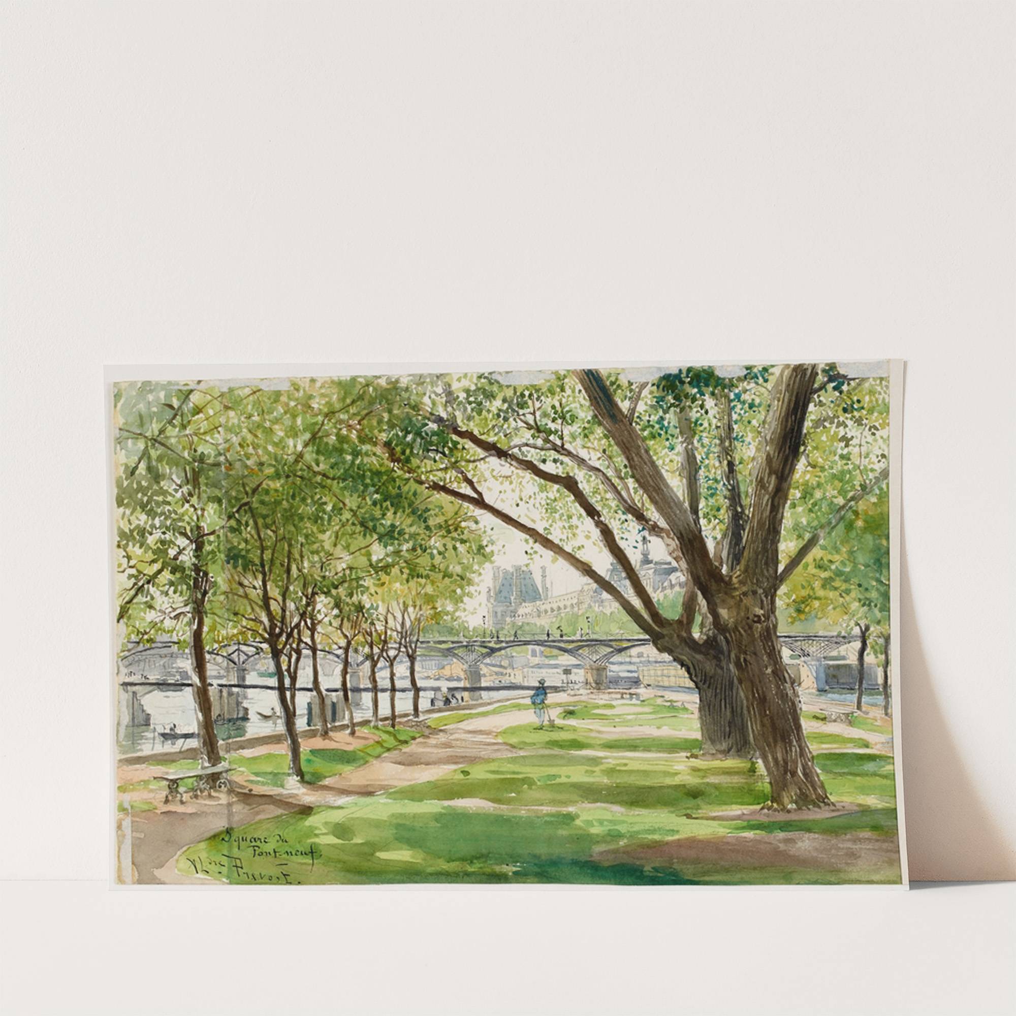 This beautifully illustrated art print depicts "Square du Vert Galant" by Alexandre Prévost, created in 1883. The piece showcases a serene park scene with lush greenery, vibrant foliage, and towering trees that stretch towards the sky. A wide, winding path...