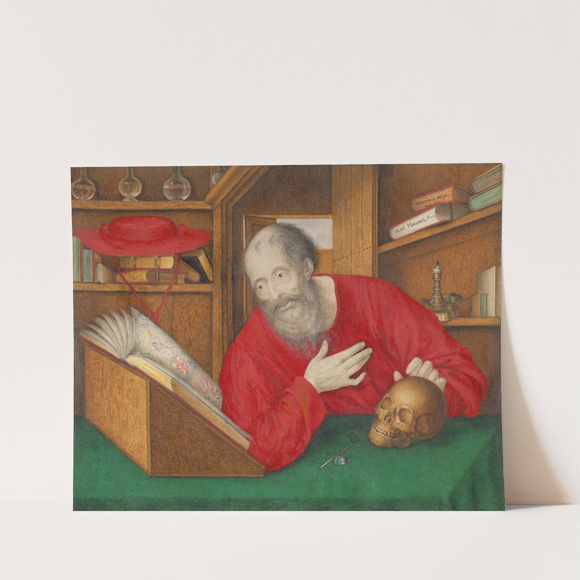 This vibrant print by Alexander Marshall features St. Jerome, the patron saint of scholars, deep in contemplation within his study. Rendered in rich, earthy tones, the piece captures St. Jerome seated at a wooden desk, engrossed in an open book...