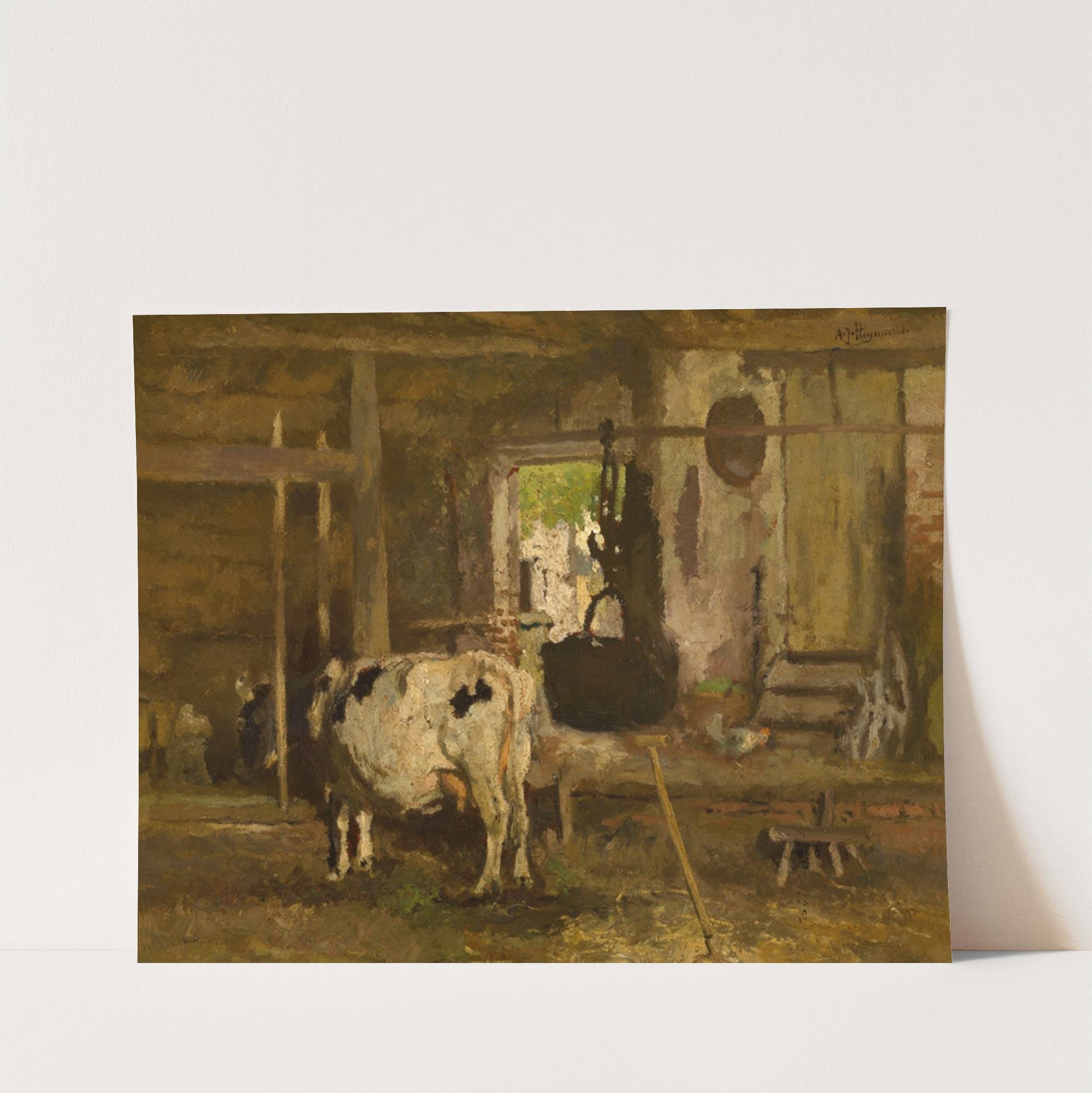 Experience the rustic charm of "Stable Interior" by Adrien-Joseph Heymans. This captivating oil painting features a dimly lit barn, where a white cow with black patches stands prominently in the foreground, its texture rendered with meticulous brushwork. The animal's calm...