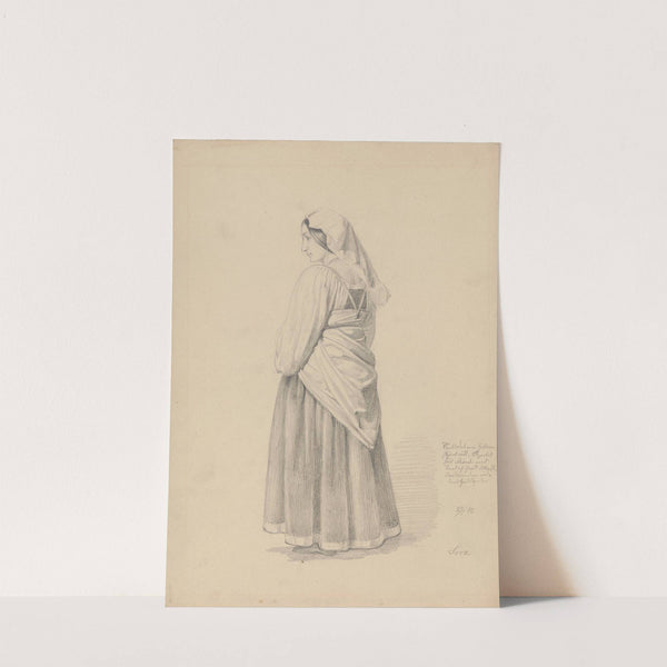 This art print features "Stående italienerinne" by Adolph Tidemand, a classic pencil drawing of a standing Italian woman. Rendered in soft grayscale tones, the woman is depicted from behind, showcasing her traditional attire with meticulous attention to detail. She wears...