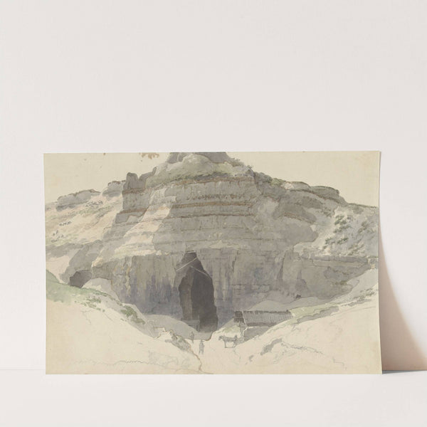 Discover the captivating beauty of "Steengroeve" by artist Abraham Teerlink, a breathtaking watercolor painting that depicts an ancient stone quarry. The artwork showcases a rugged cliff with prominent horizontal rock layers in shades of white, gray, and subtle hints of...