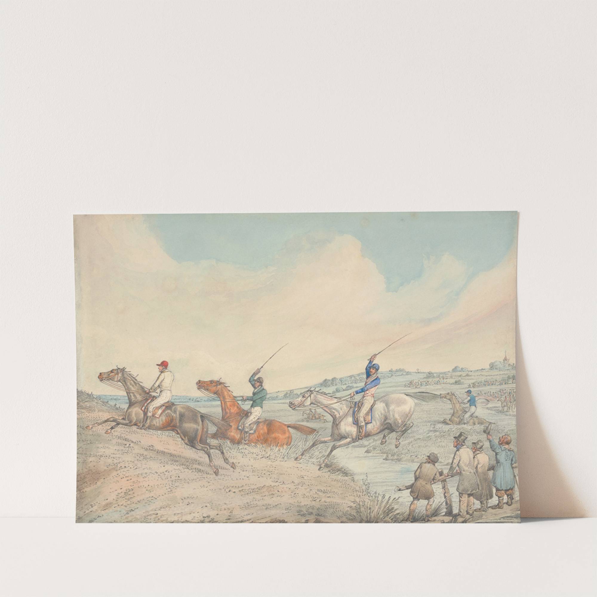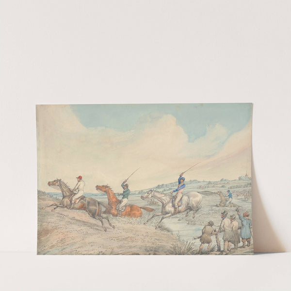 Steeplechasing; Three Riders Taking a Brook, Spectators on Right by Henry Thomas Alken - Wall Art Print