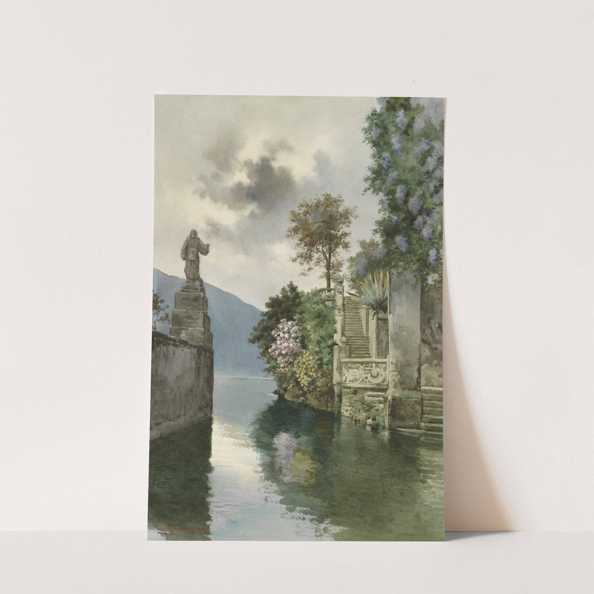 This artwork, titled "Steinweg zum Seufer" by Alberto Prosdocimi, captures a serene lakeside scene with delicate watercolor techniques. In the foreground, an intricately carved stone staircase leads down to calm, reflective waters. A statue of a saint stands vigilantly at...