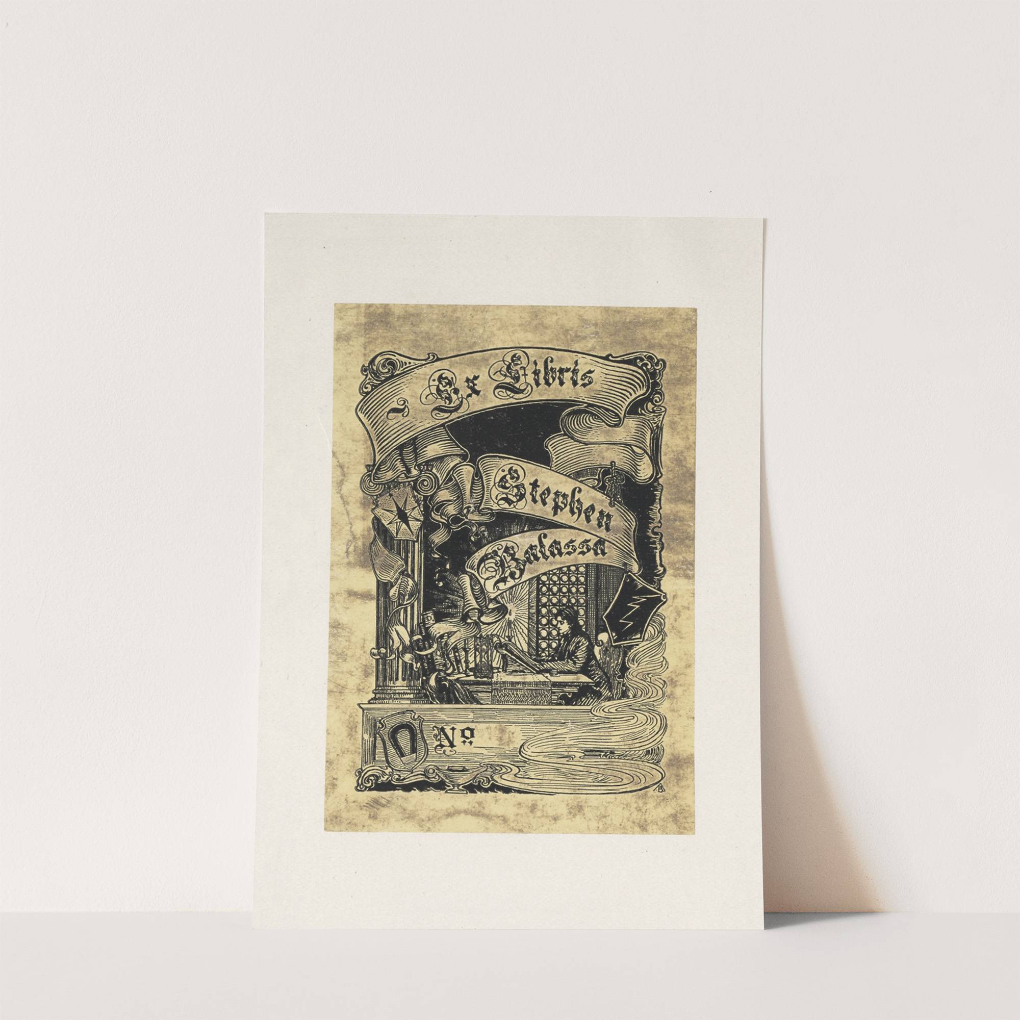 This art print showcases "Liber Stephani," a meticulously detailed monochromatic illustration in a vintage style. The piece is rendered in black ink with a sepia-toned background, evoking an antique feel. Central to the image are ornate scrollwork and banner elements...
