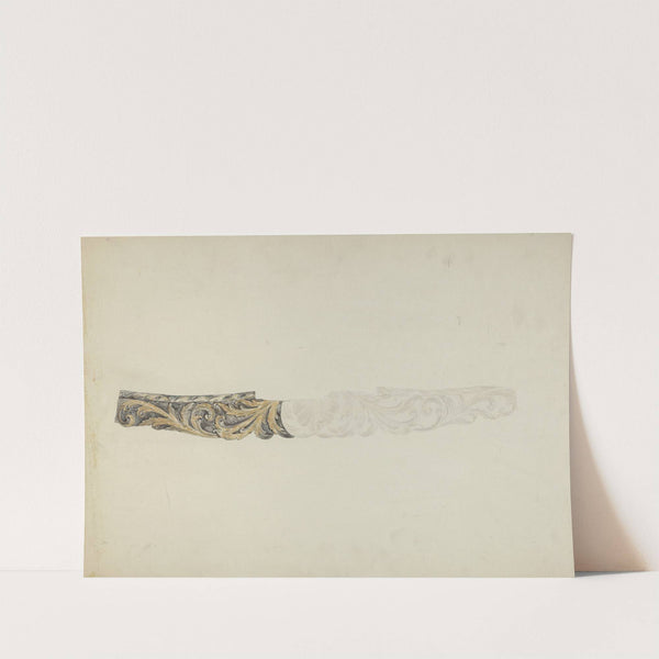 This artwork is "Stern Piece from Henrietta Francis" by the artist associated with the American 20th Century style. The piece showcases an intricately detailed hilt of what appears to be a sword or dagger, rendered in a strikingly realistic manner....