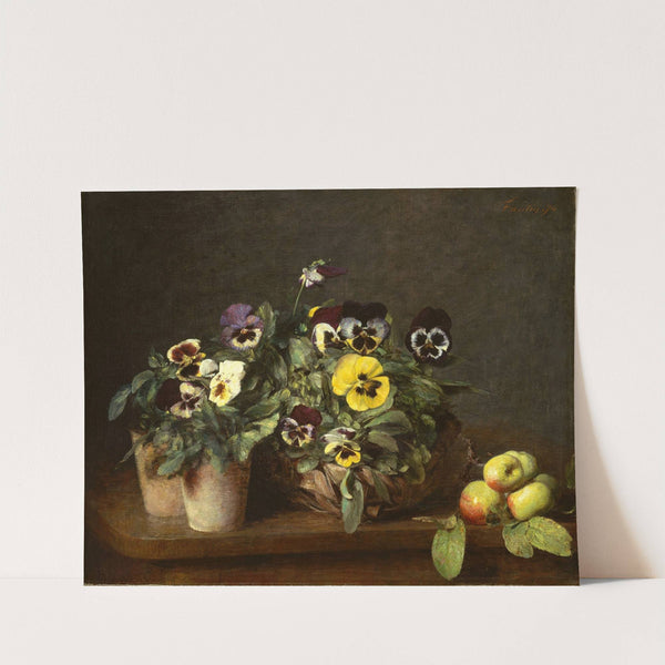 This art print features "Still Life with Pansies" by Henri Fantin-Latour, showcasing a classic still life composition. The painting beautifully captures a vibrant bouquet of pansies in various shades of yellow, purple, and black with intricate patterns on their petals....