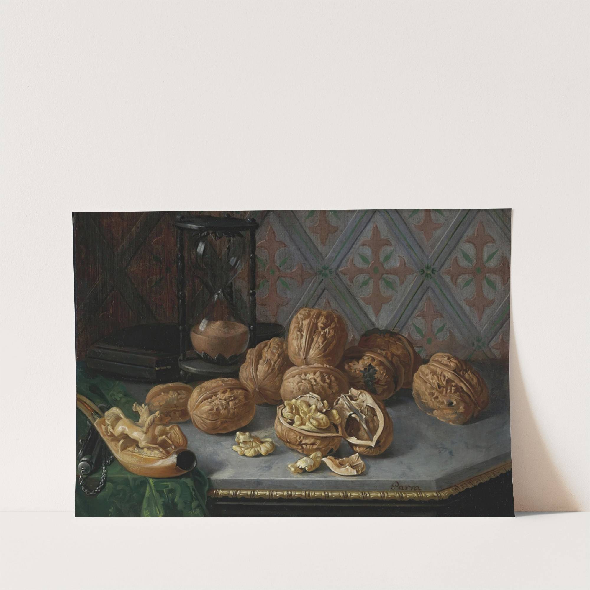 Still Life With Wallnuts, A Pipe And Hourglass On A Grey Marble Ledge by Miguel Parra Abril - Wall Art Print