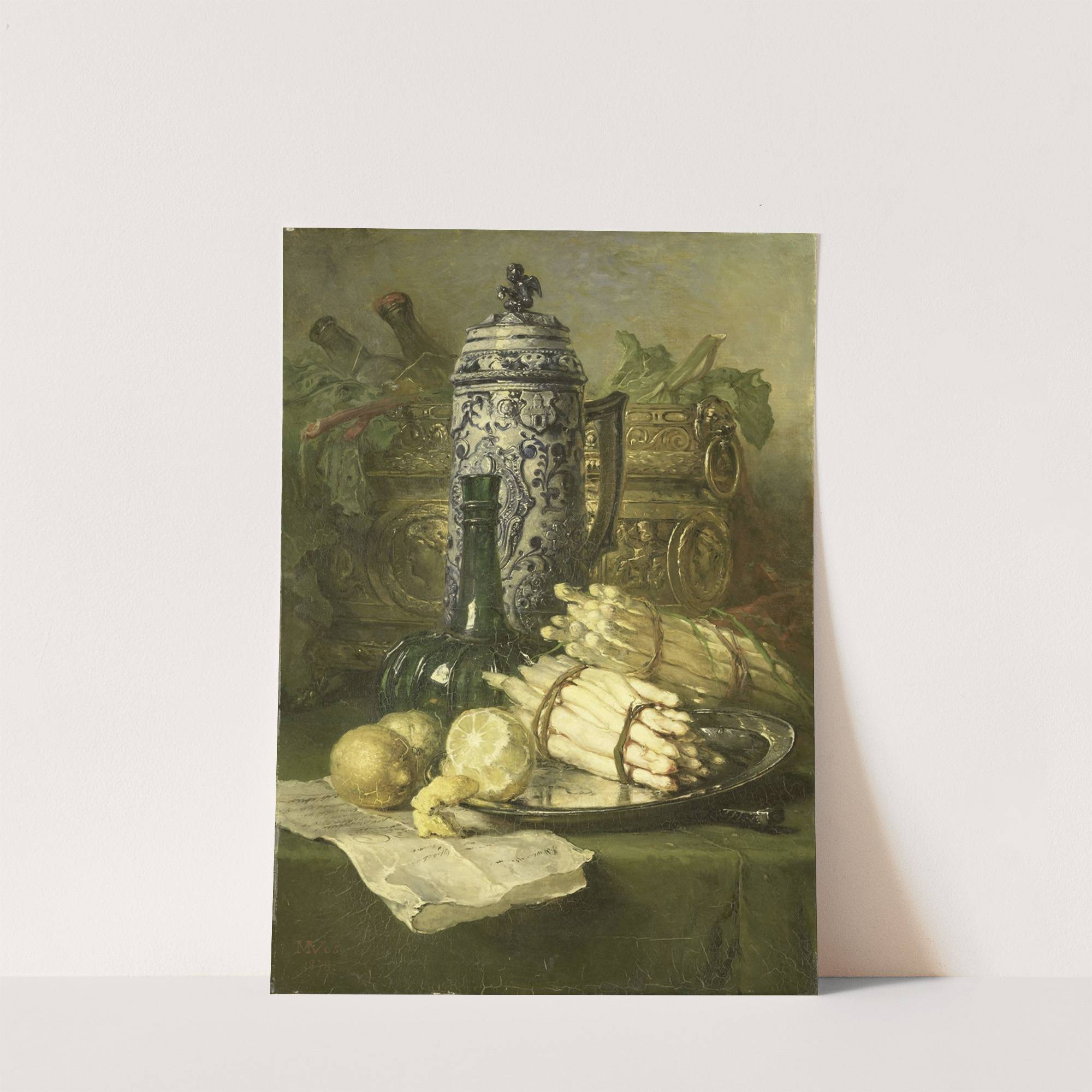 Experience the classic realism of "Stilleven met kan van steengoed" by Maria Vos. This stunning painting showcases an intricately detailed still life scene that exudes a timeless charm. At its center, a beautifully patterned blue and white porcelain cooler with...