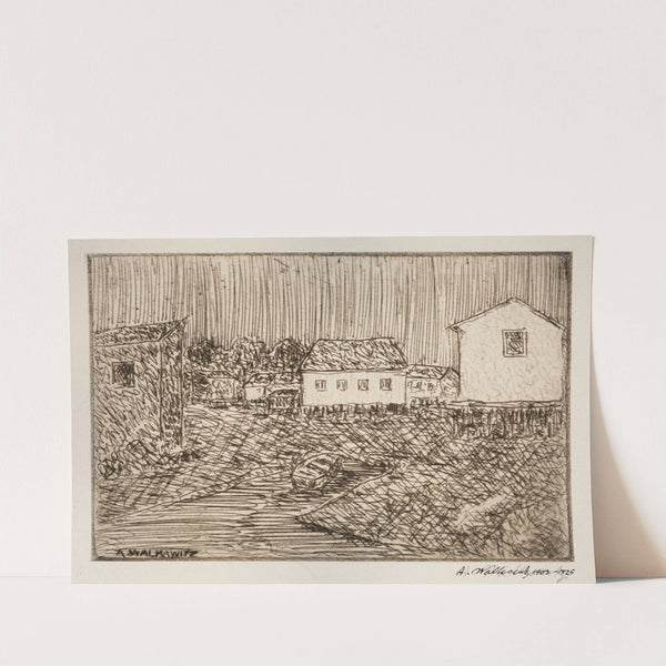 This artwork is "Street Scene" by Abraham Walkowitz, showcasing a beautifully intricate black-and-white etching. The piece captures an old European village street with a rustic charm. In the foreground, there are detailed line patterns that suggest roof tiles and pavement....