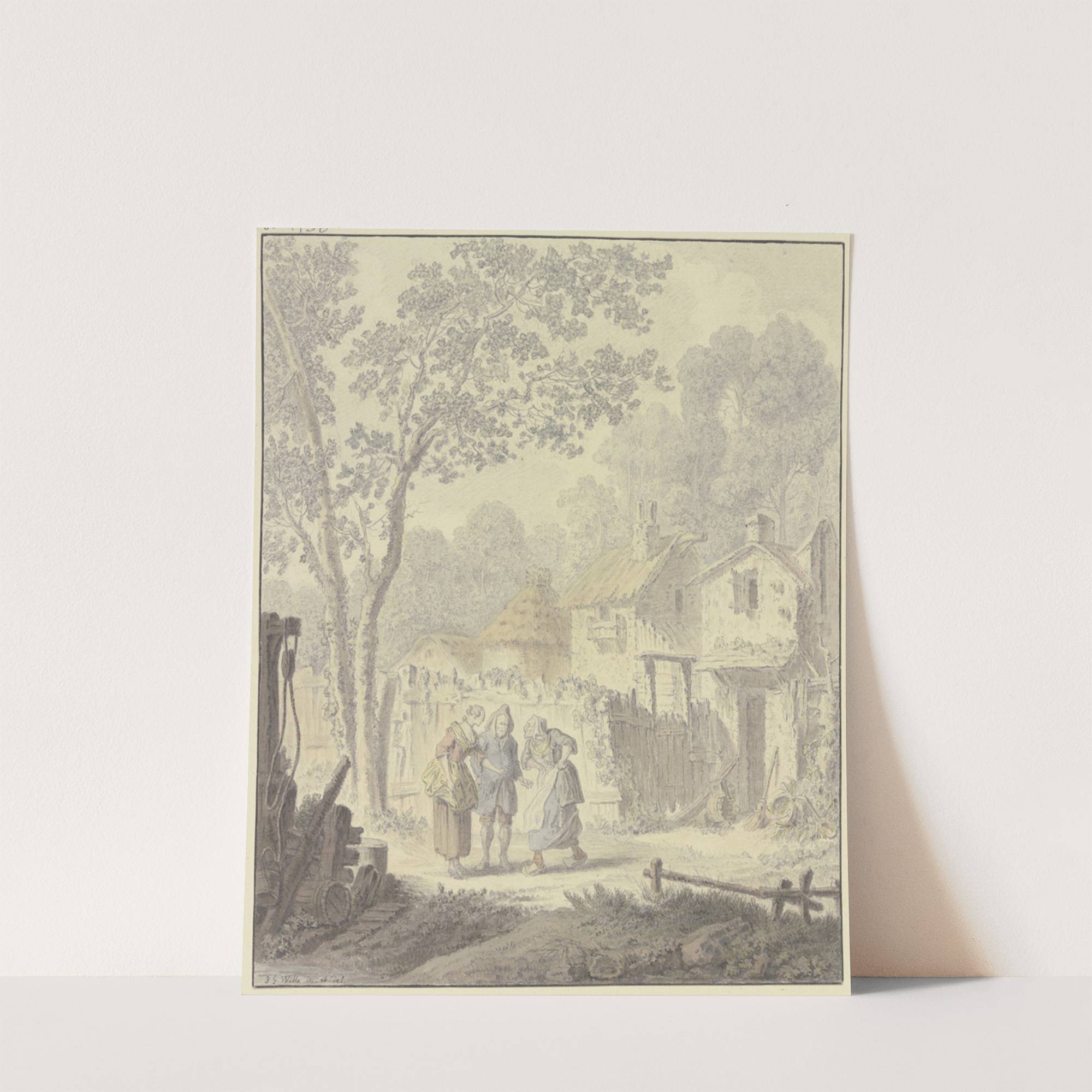 This charming art print captures a serene rural village scene in delicate watercolor hues. The illustration depicts three villagers—two women and one man—engaged in conversation near a rustic wooden fence that extends across the right side of the composition. The...