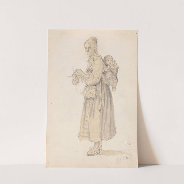 This beautiful monochrome artwork titled "Strikkende kvinne med barn på ryggen, Rättvik" is a masterful pencil drawing by the renowned artist Adolph Tidemand. The piece showcases a mature woman standing with a serene yet focused expression as she looks downward...