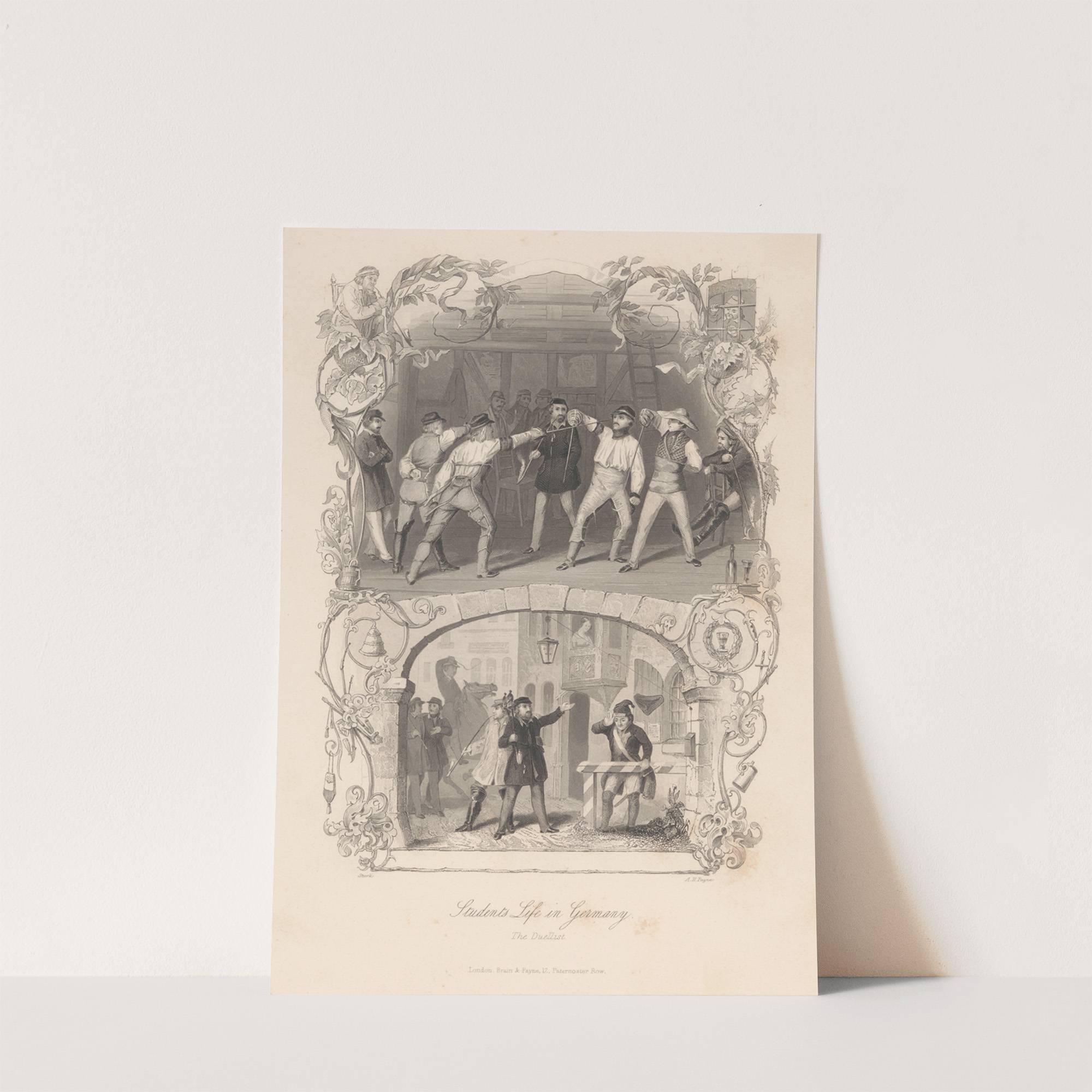 This elegant art print features "Students' Life in Germany, The Duelist" by Albert Henry Payne, capturing a lively 19th-century scene with meticulous detail. The monochromatic illustration, rendered in soft gray tones, showcases six young men engaging in an animated duel...