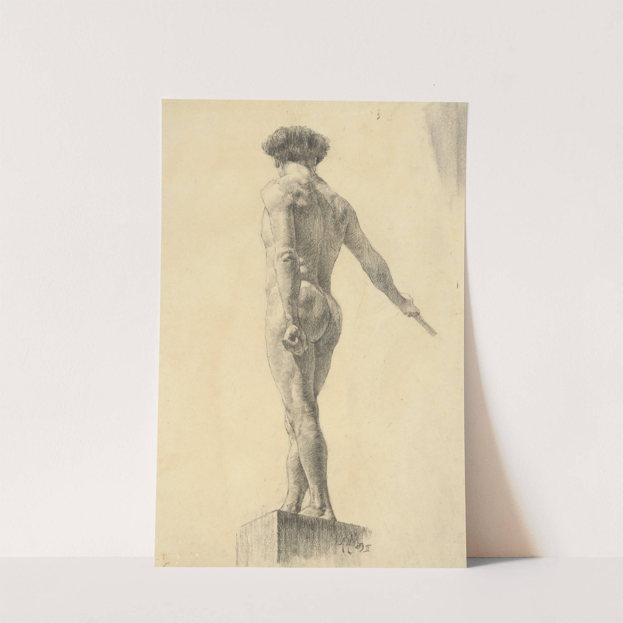 This artwork, "Štúdia aktu stojaceho muža" by Ákos Aranyossy, is a monochromatic pencil drawing of a classical male figure standing in profile. The subject, depicted from the back, stands with one arm slightly extended and the other resting near his...