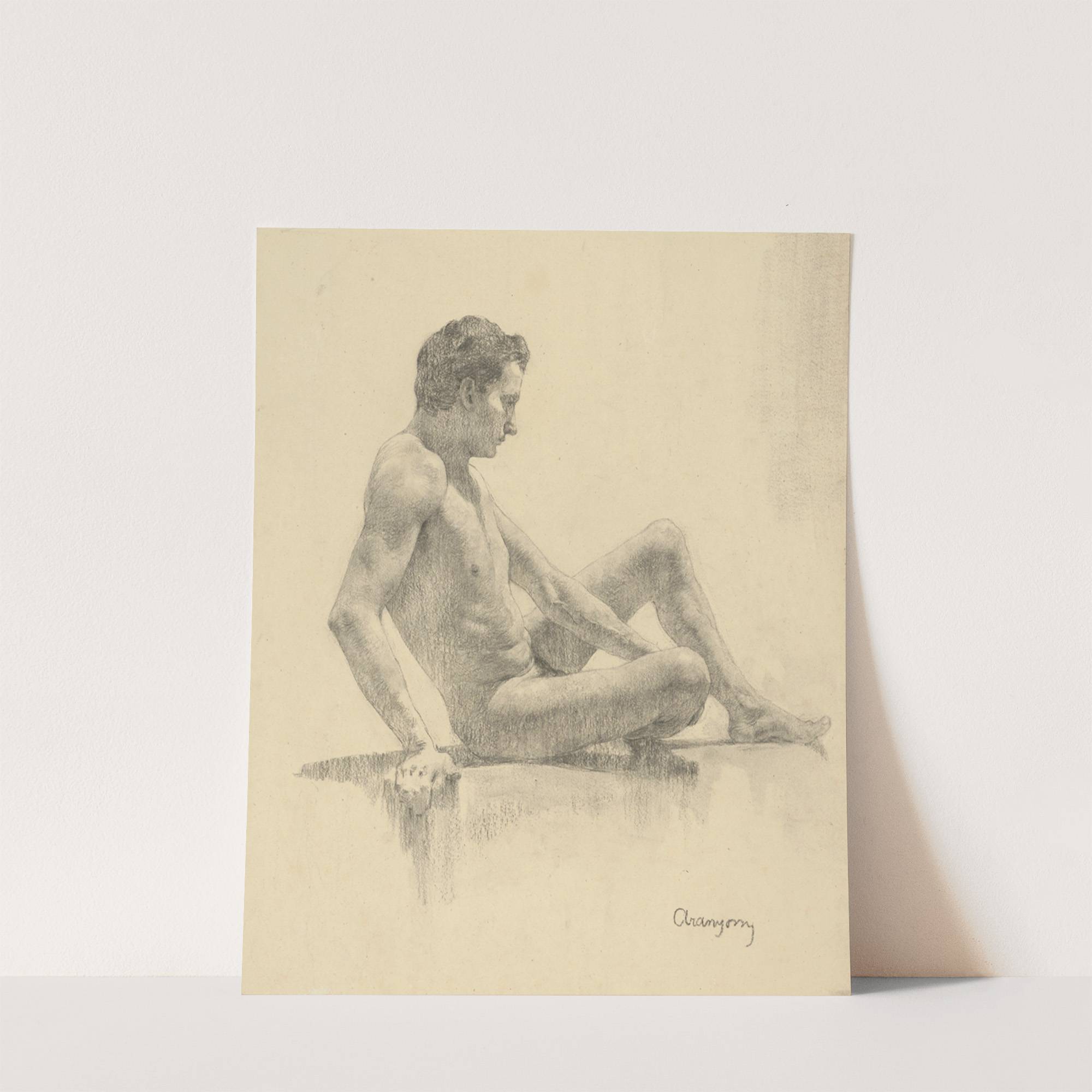 This artwork is a meticulously detailed black-and-white pencil drawing titled "Štúdia muža sediaceho a opierného sa o pravú ruku" by artist Ákos Aranyossy. The piece captures the contemplative profile of a nude male figure seated on the floor, leaning back...