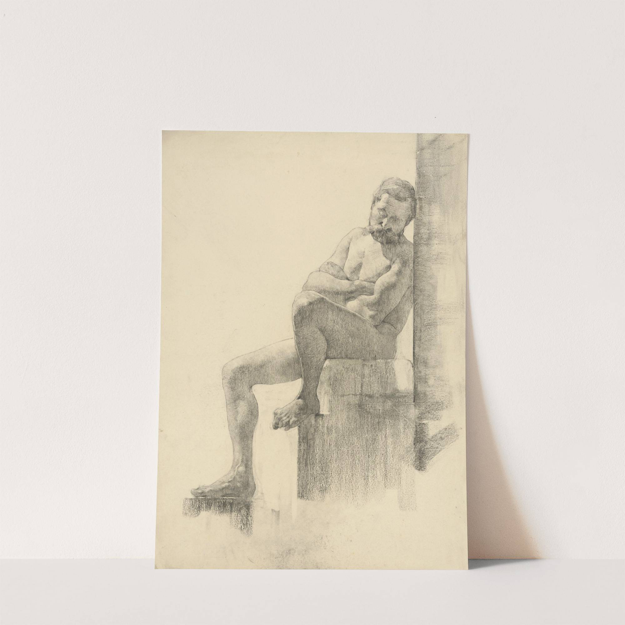 This monochromatic pencil drawing features a man seated against a vertical surface with his arms crossed over his midsection, exuding a relaxed yet contemplative demeanor. The artist, Ákos Arányi, employs soft shading and delicate pencil strokes to create a textured,...
