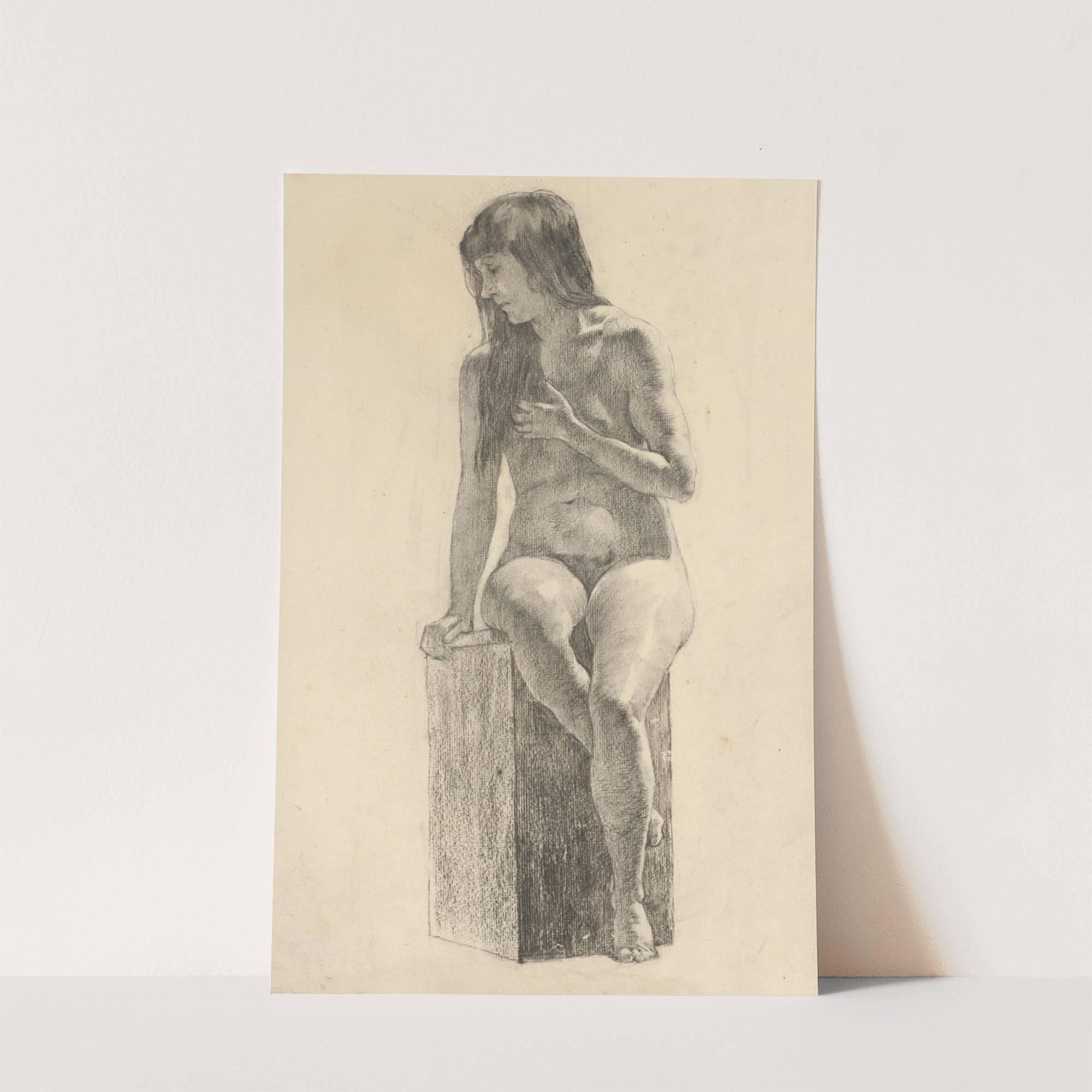 This black-and-white pencil drawing captures a serene and contemplative nude female figure sitting on a rectangular block. The artist, ?kos Aranyossy, expertly uses shading to highlight the woman's natural curves and delicate features. Her long hair cascades down her back,...
