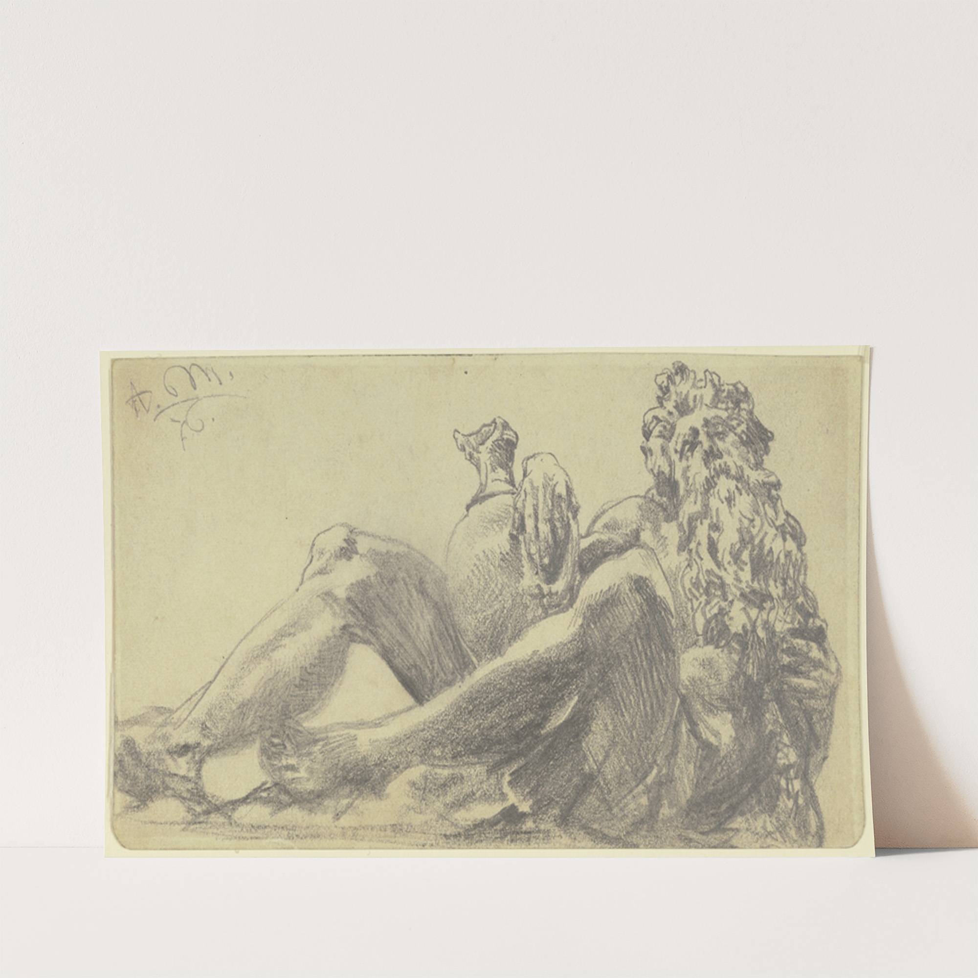 This artwork features "Studie nach einer Brunnenfigur" by the renowned artist Adolph von Menzel, rendered in a monochromatic pencil sketch style. The composition captures a reclining figure with elongated limbs and soft contours, exuding a relaxed, almost languid pose. The...
