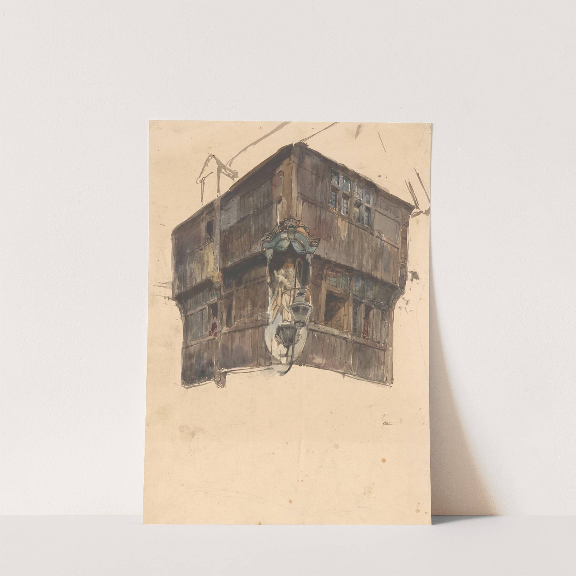 This artwork presents a charming, detailed illustration of a rustic wooden building, titled "Studie van de bovenste verdieping van een hoekhuis" by artist Johannes Bosboom. The building appears weathered and aged with dark brown wood panels showing signs of wear...