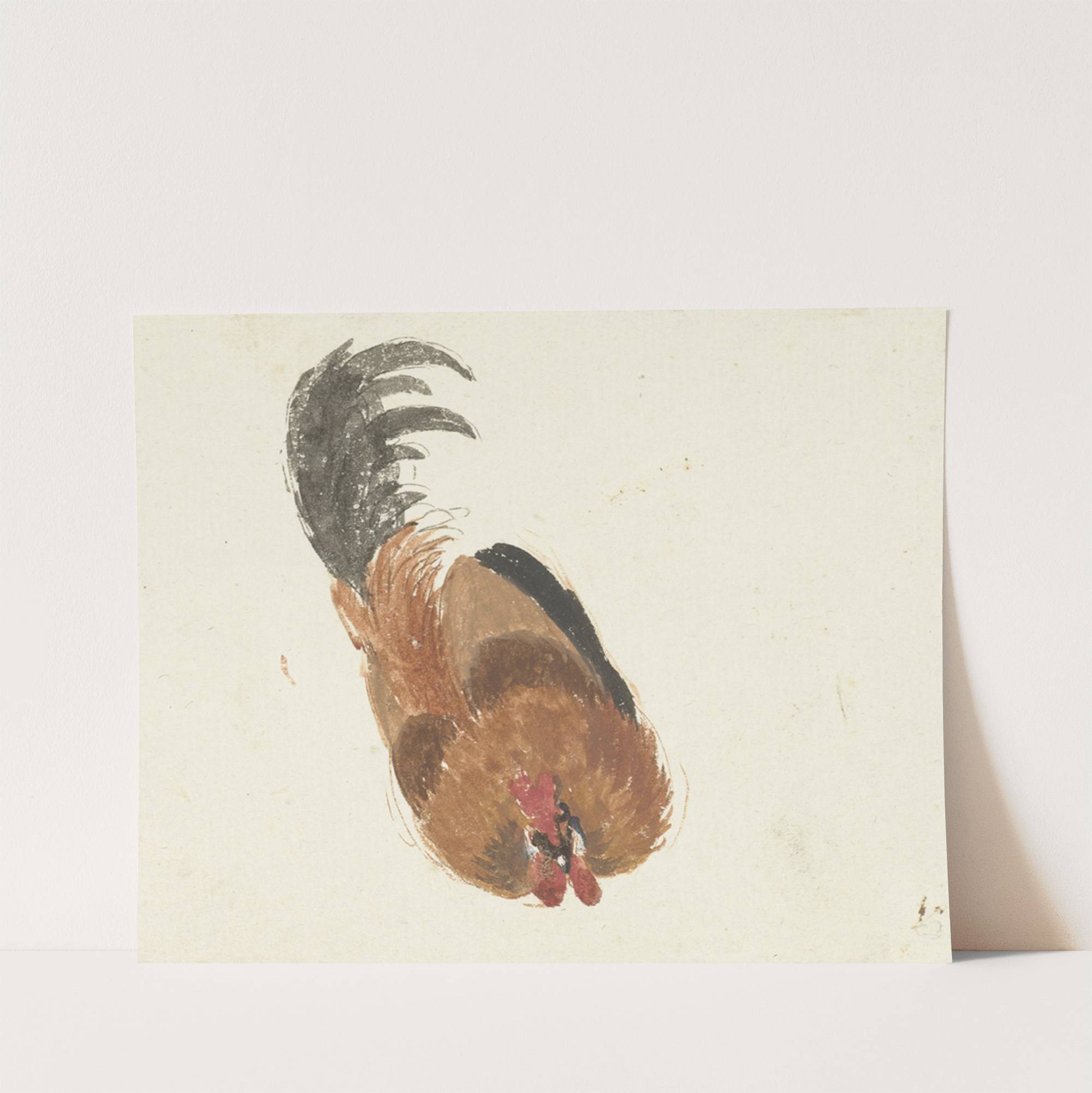 Introducing "Studie van een dode haan" by Aert Schouman—a captivating watercolor painting that brings the lifeless rooster to vibrant, yet poignant life. This art print features a rooster with richly detailed plumage in warm shades of brown and orange, transitioning...