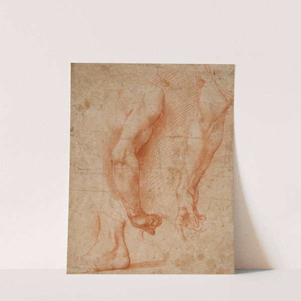This art print features "Studien von zwei Armen und eines Fuß" (Study of Two Arms and One Foot) by the renowned Renaissance artist Andrea del Sarto. Executed in delicate red chalk on aged, slightly yellowed paper, this sketch captures a...