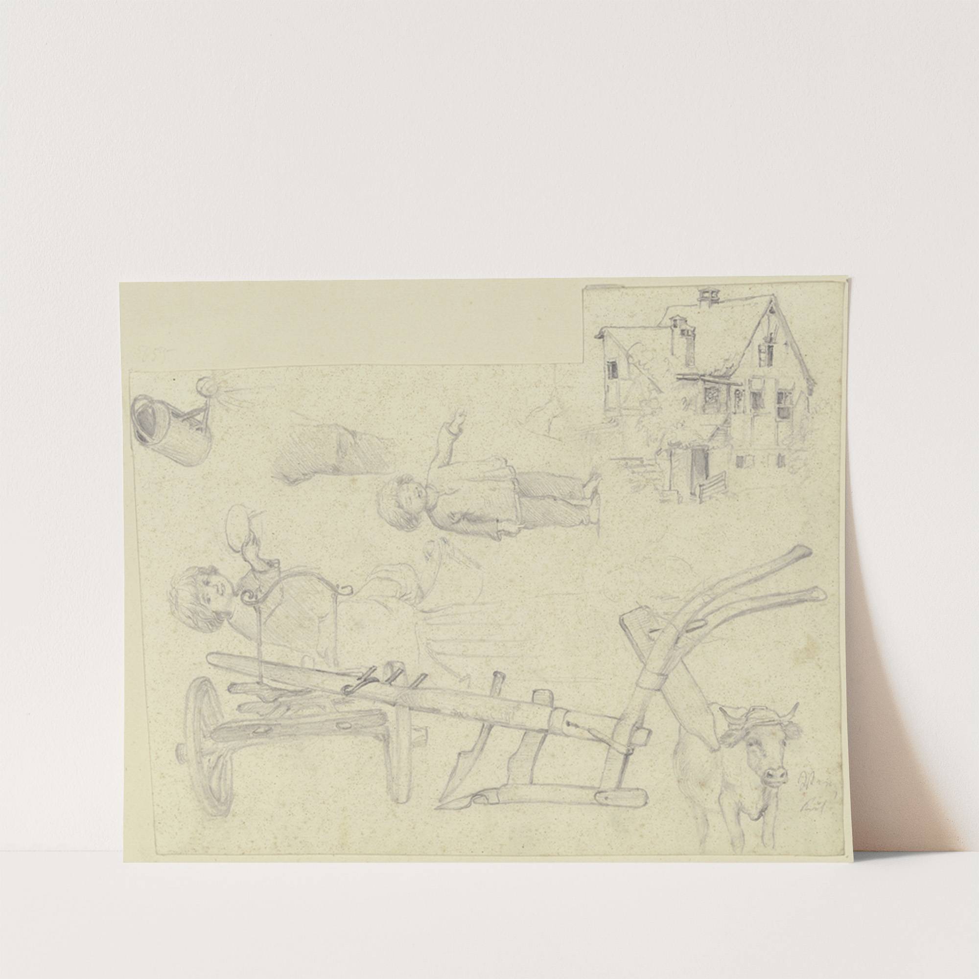 Studienblatt; Figuren, Objekte, ein Haus und ein Rind by Teutwart Schmitson - Wall Art Print