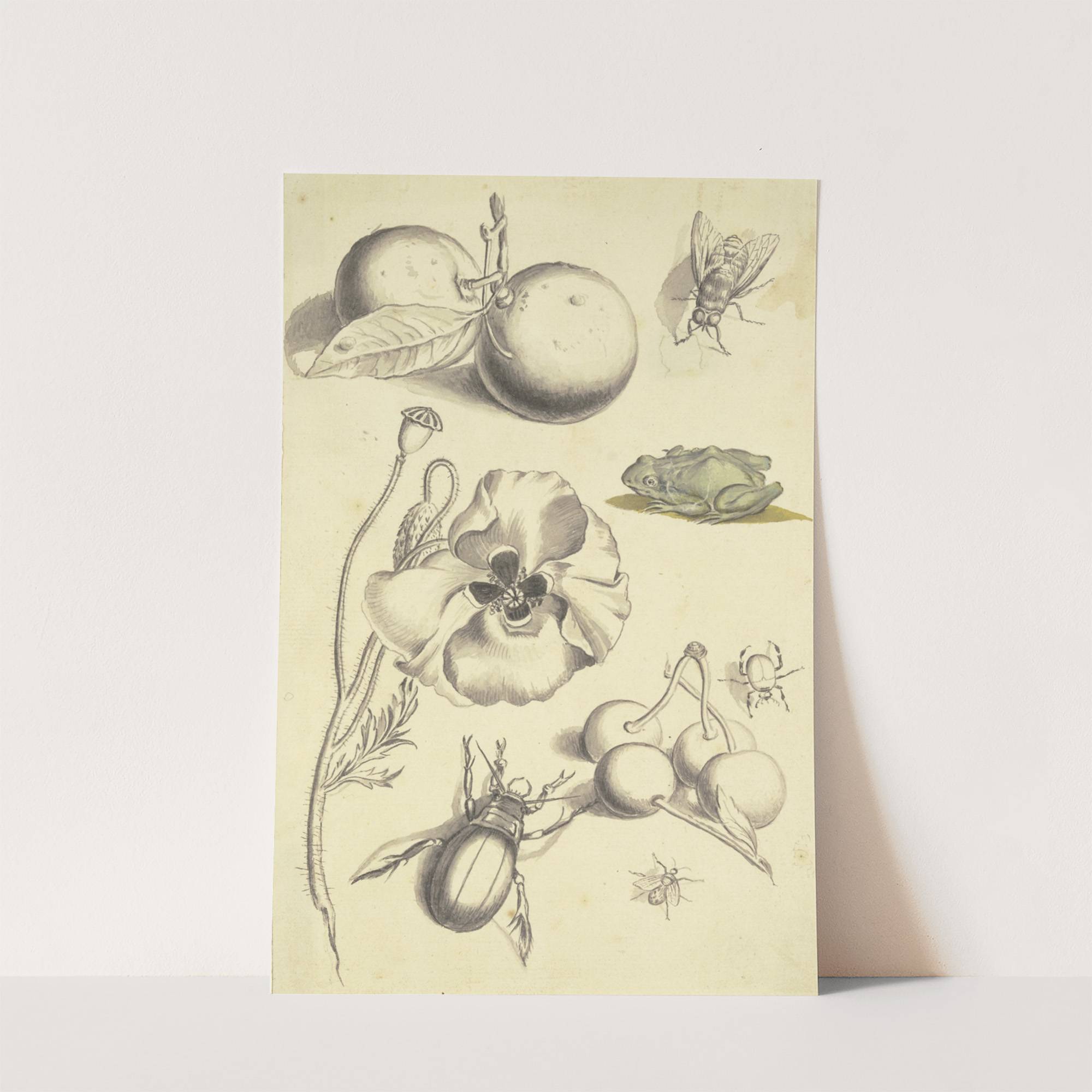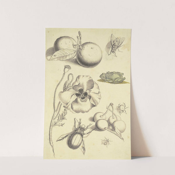 Studienblatt mit einer Mohnblume, Pflaumen, Kirschen, zwei Käfern, einer Fliege, einer Biene und einem Frosch by Johann Daniel Bager - Wall Art Print