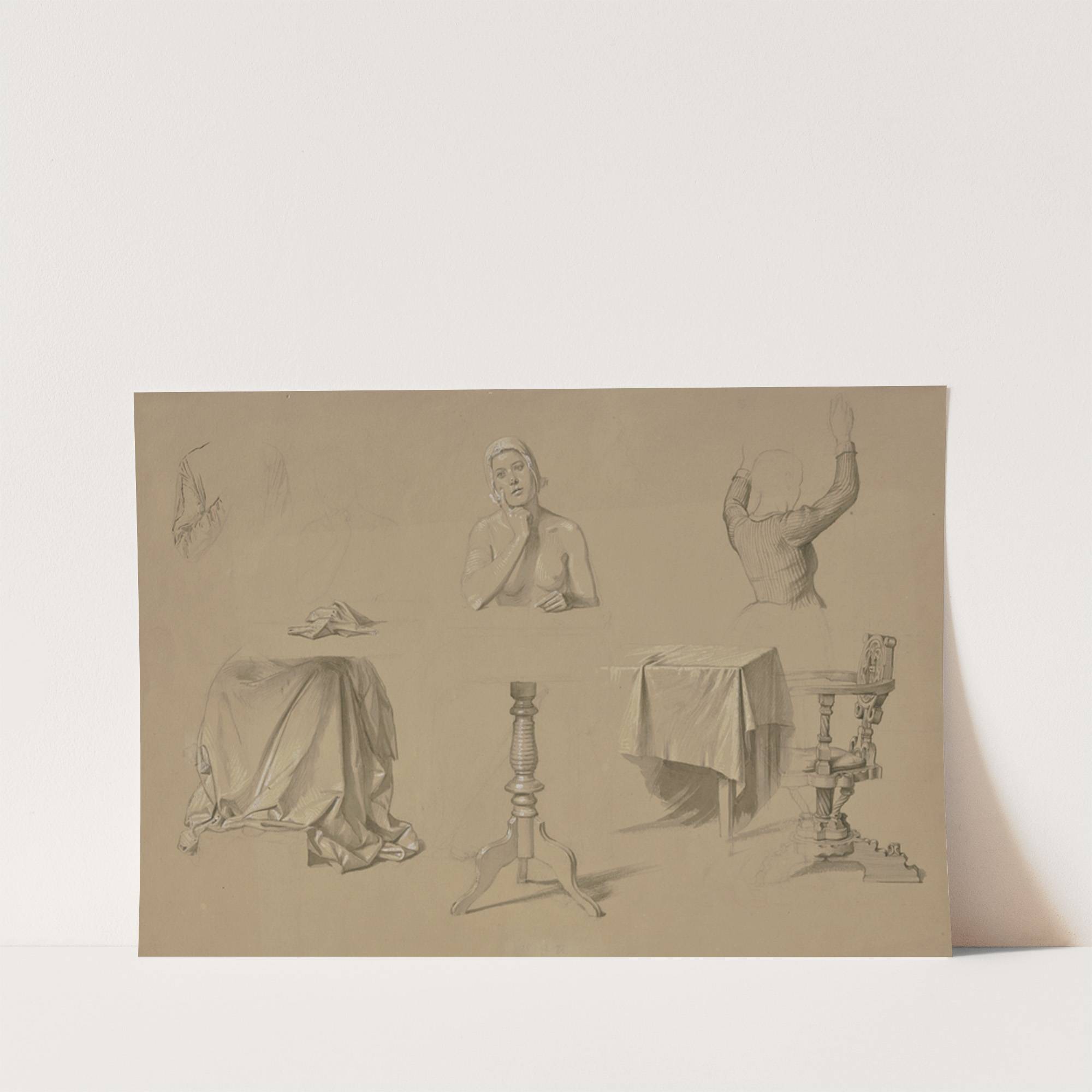 Studienblatt; Weiblicher Halbakt, Frau mit erhobenen Armen, Faltenstudien, Tisch und Lehnstuhl by Josef Ferdinand Becker - Wall Art Print