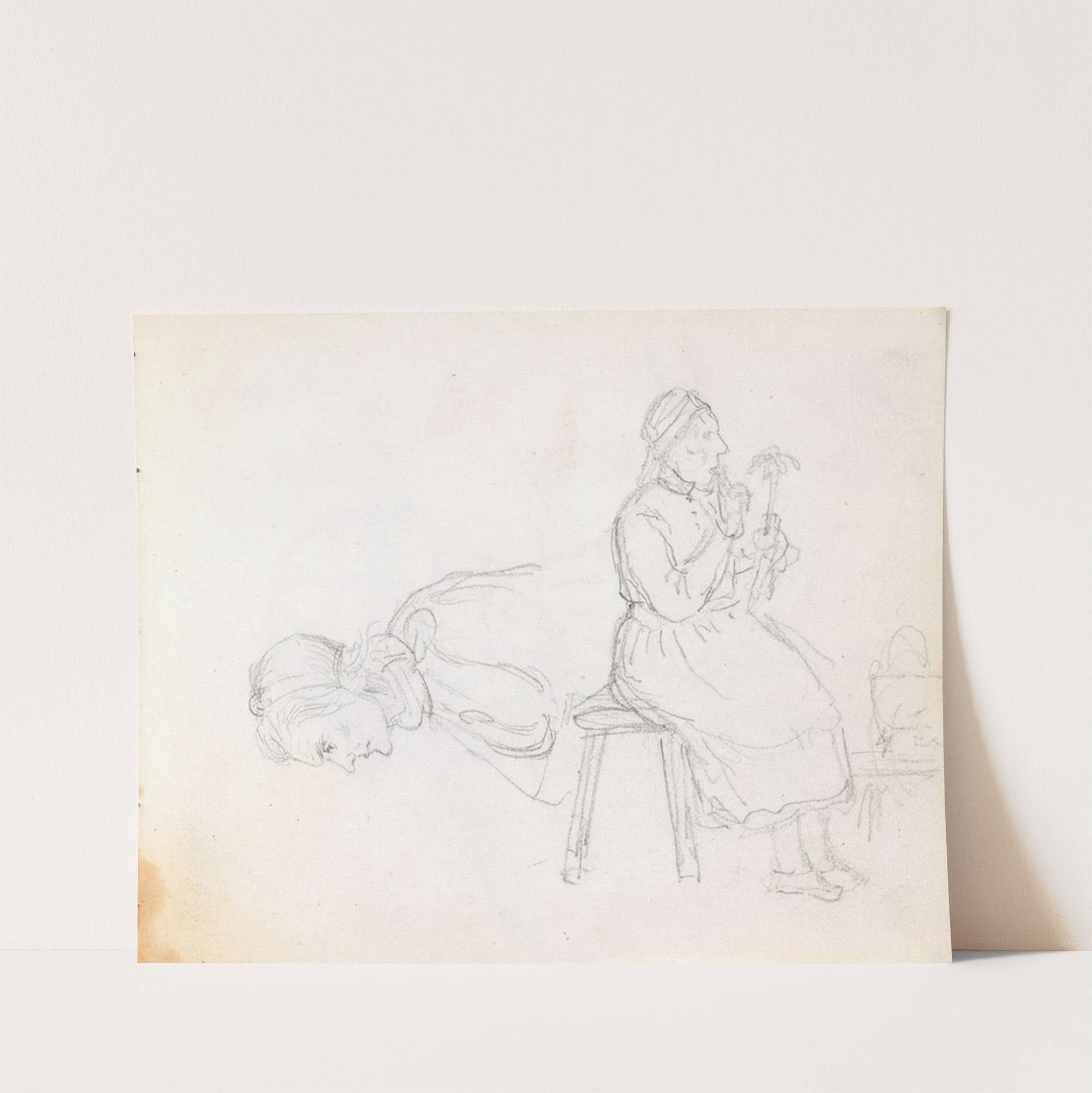 This art print features "Studier av eldre kvinne" by Adolph Tidmand, showcasing an elegant line drawing in monochrome. The minimalist sketch captures two figures with delicate, flowing lines, emphasizing the artist's technique and style. On the right, a seated figure...