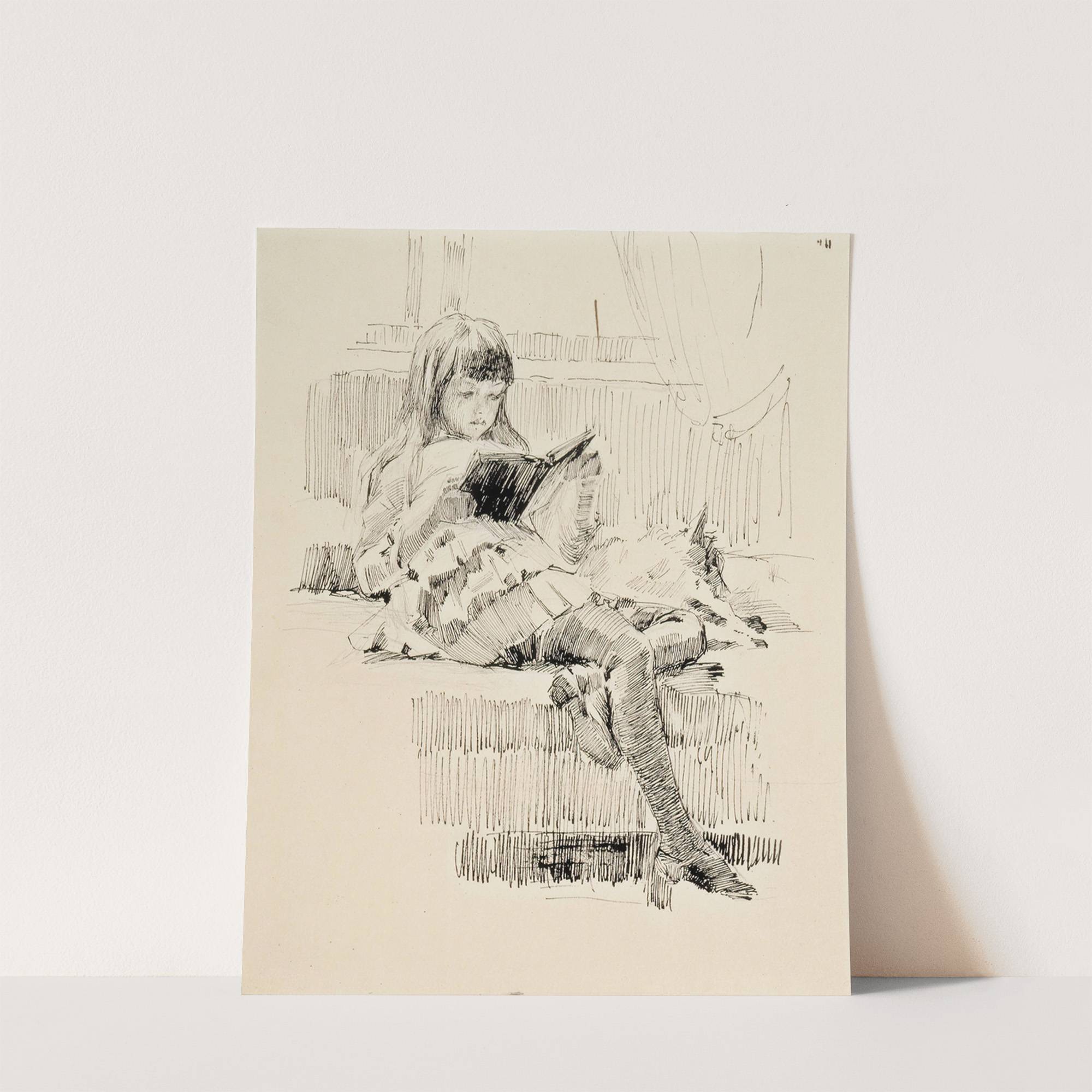 This black-and-white sketch captures a serene moment of relaxation with "Study, Good Friends" by Albert Edelfelt. The central figure is a young woman with straight hair, sitting comfortably on a couch. She leans back slightly, engrossed in reading a large...