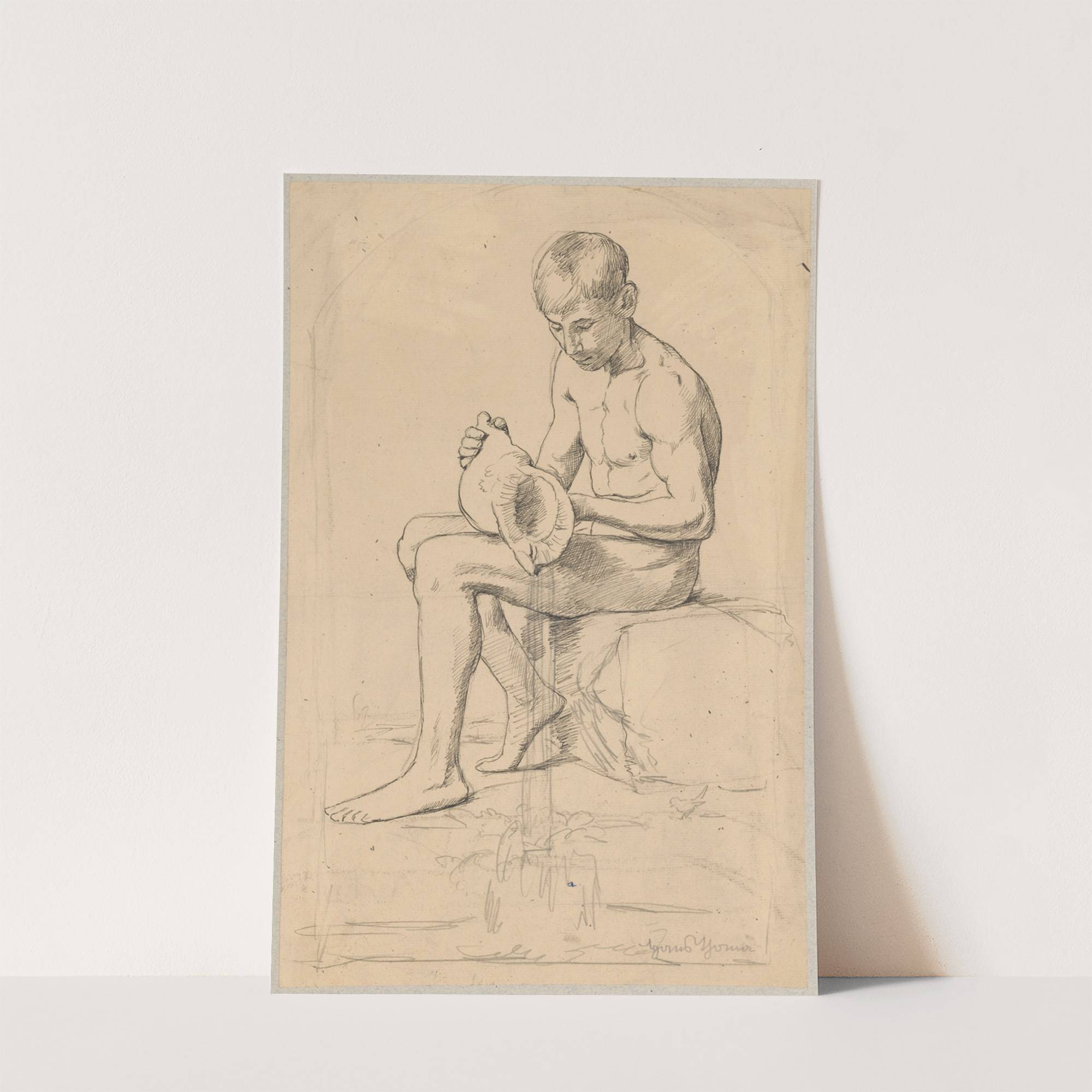 Study of a naked boy sitting on a stone and pouring water out of a shell (1880 - 1900) by Hans Thoma - Wall Art Print